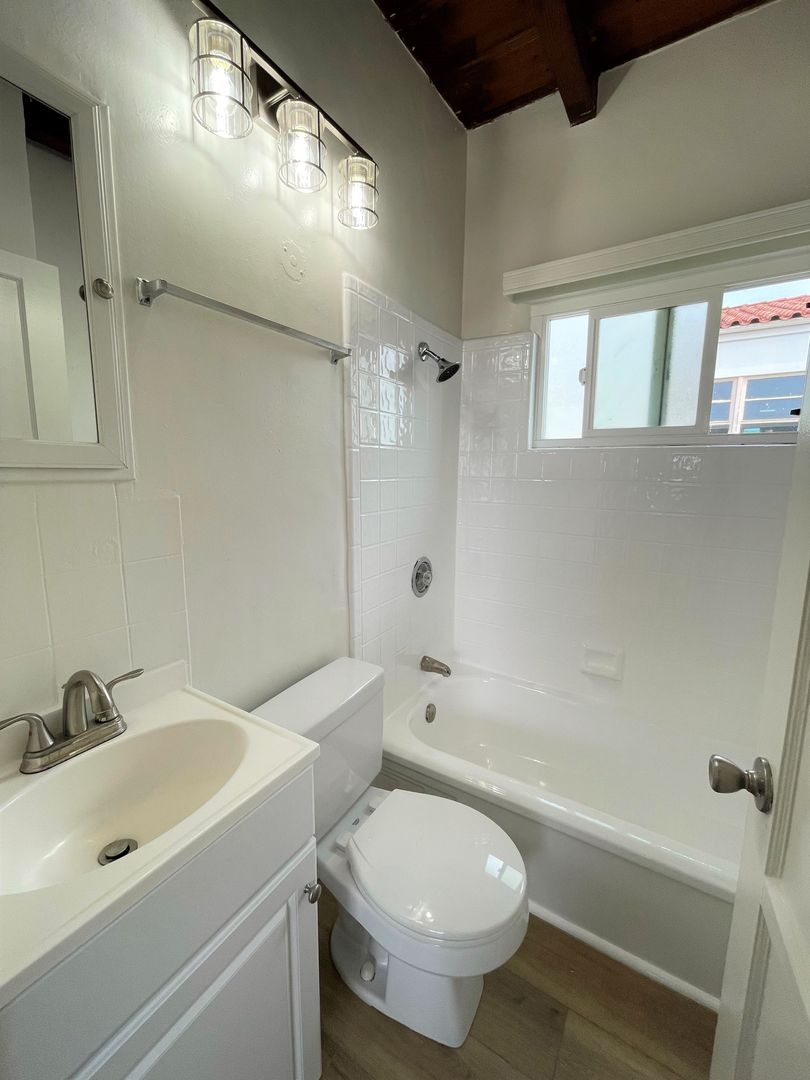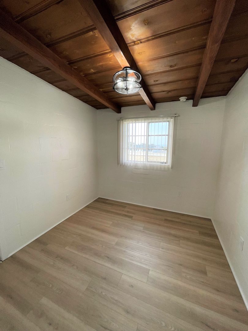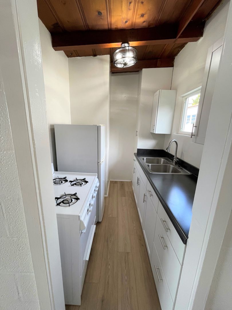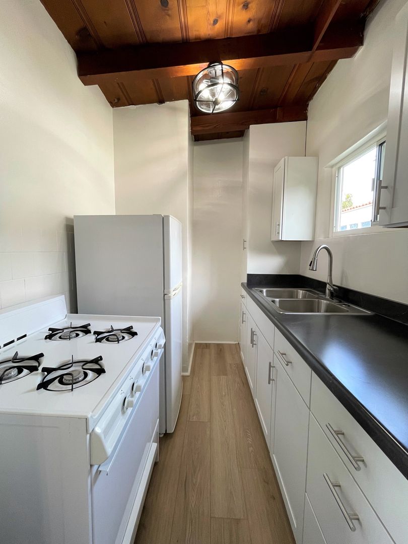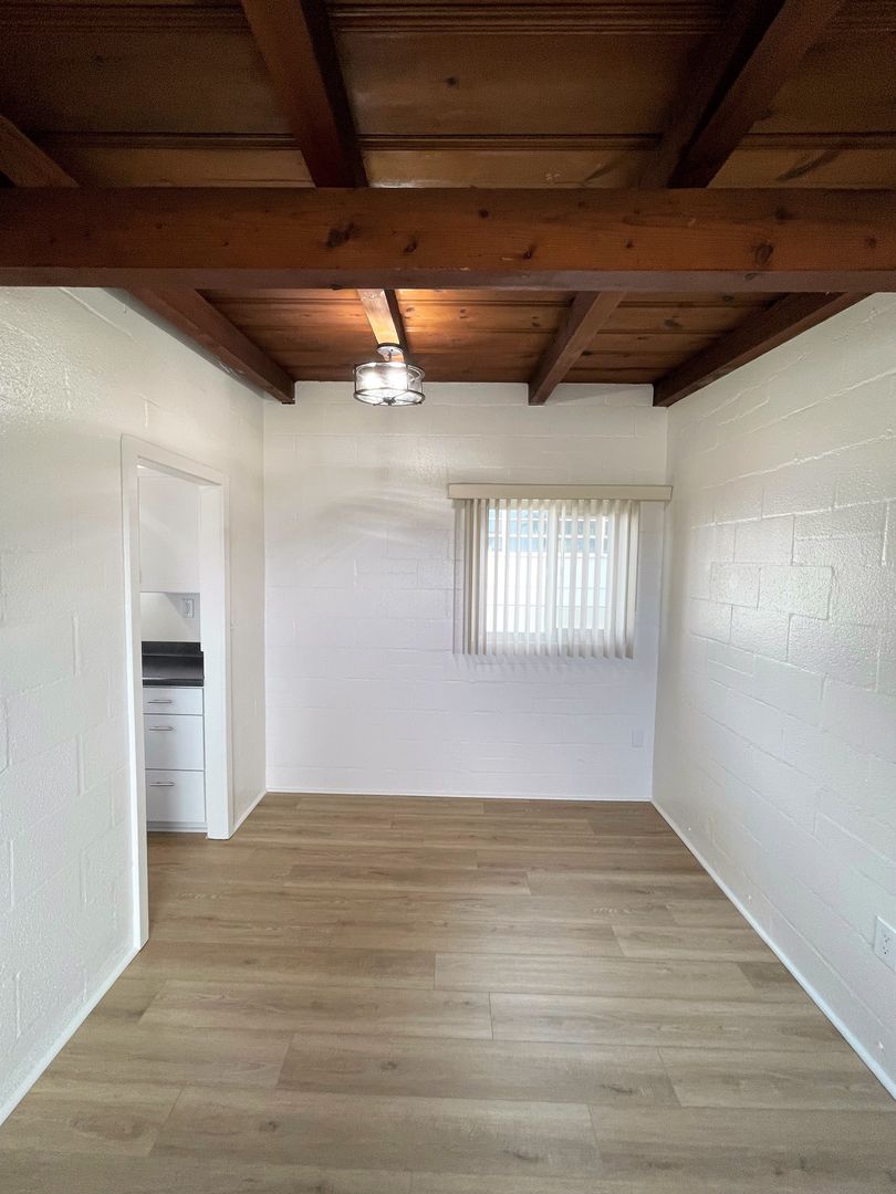 Charming Midtown Ventura Apartment! Enjoy beautiful ocean views as you walk up the staircase to this upstairs one bedroom one bath apartment! The interior has been remodeled with laminate wood flooring. The quaint living area has beautiful wood beam ceilings and a roomy closet. Your galley kitchen has been remodeled with white shaker style cabinetry, faux marble style countertops, and has a separate dining space.