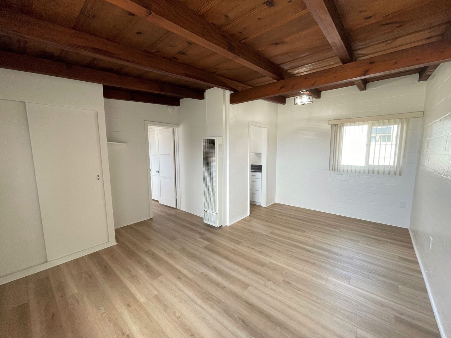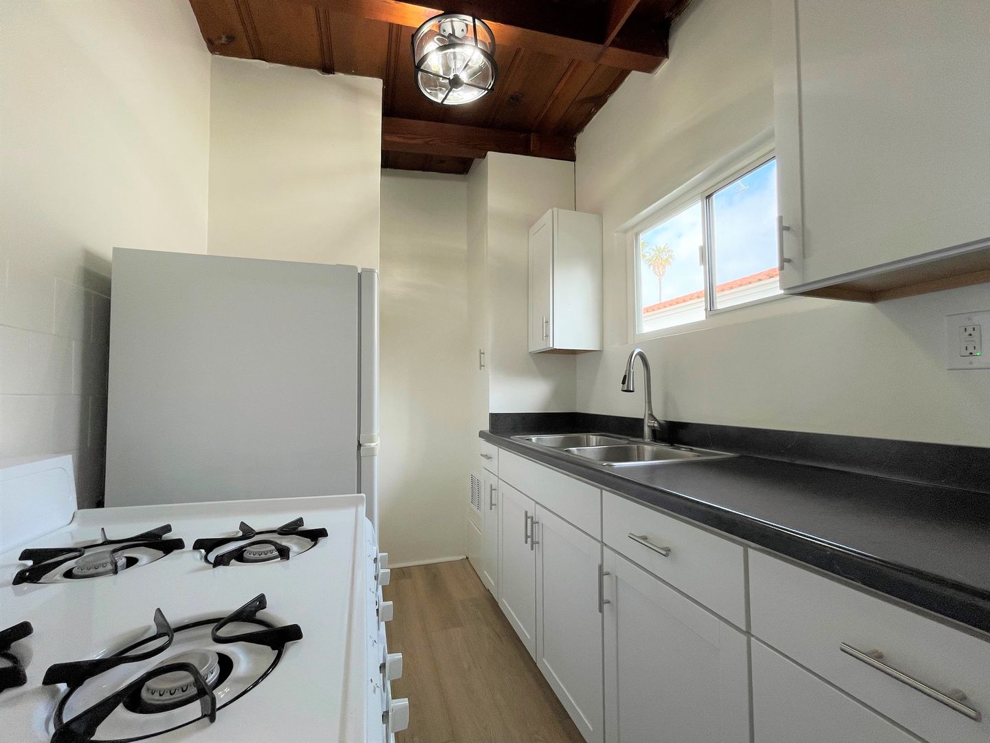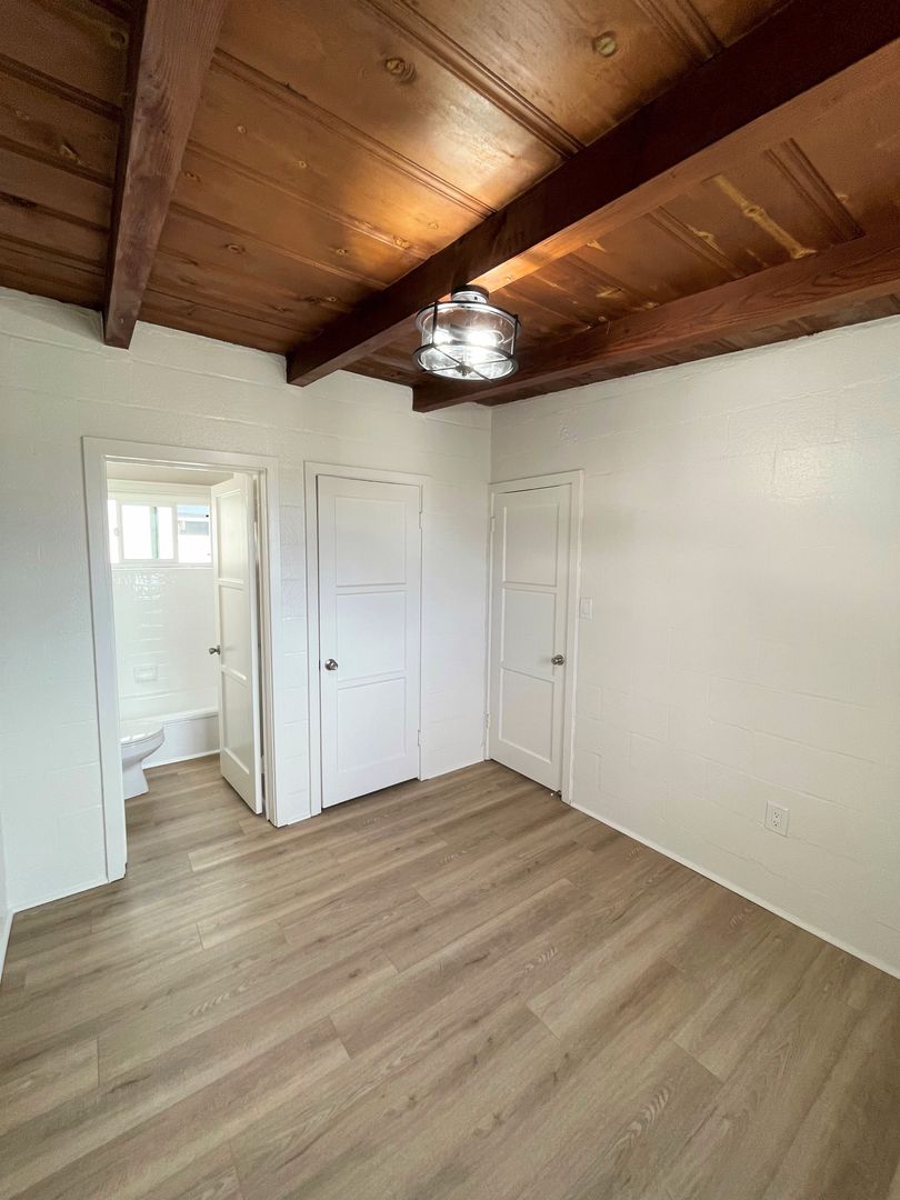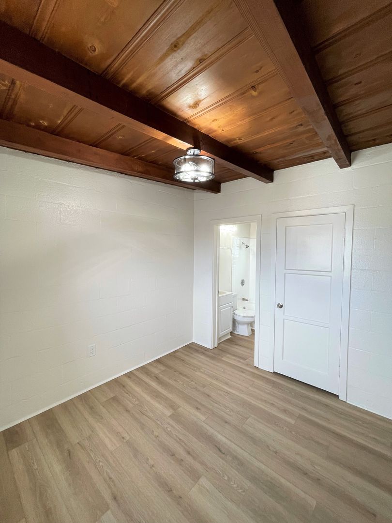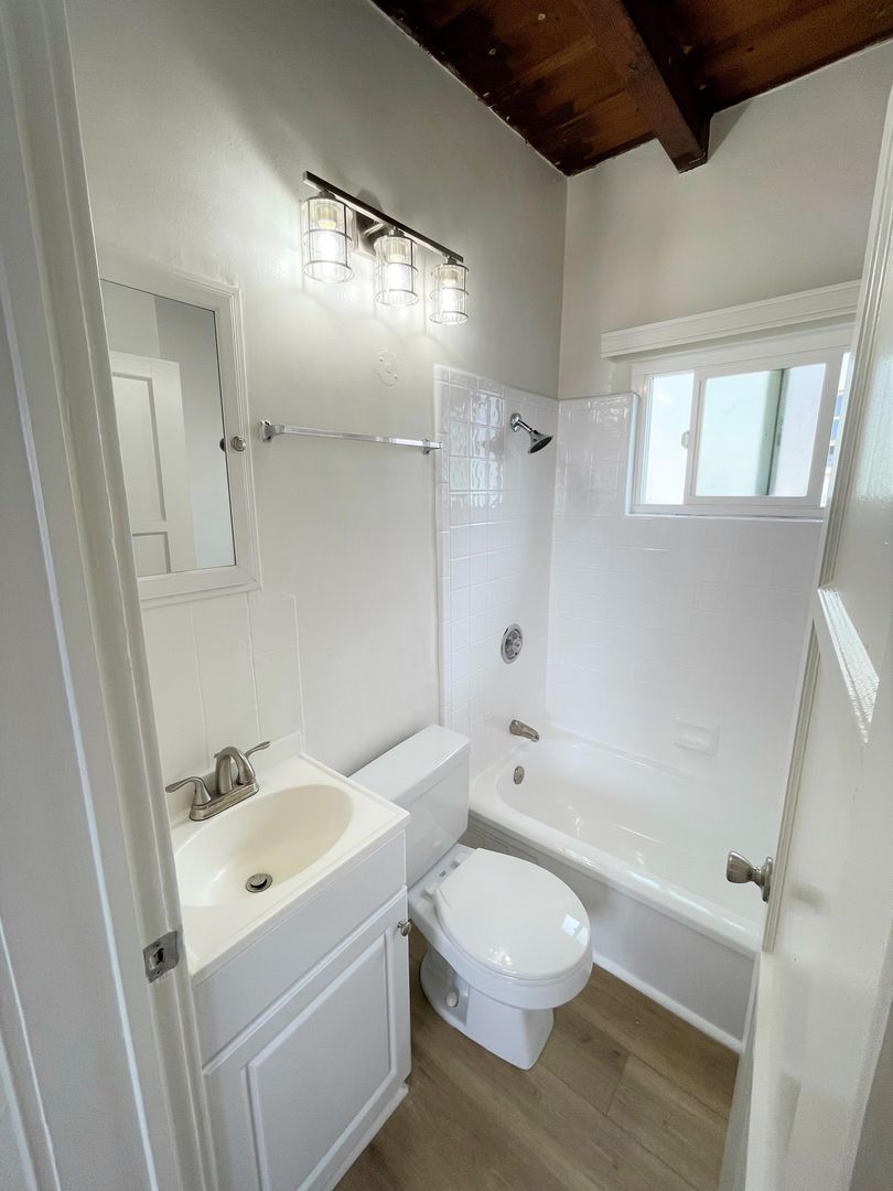 Charming Midtown Ventura Apartment! Enjoy beautiful ocean views as you walk up the staircase to this upstairs one bedroom one bath apartment! The interior has been remodeled with laminate wood flooring. The quaint living area has beautiful wood beam ceilings and a roomy closet. Your galley kitchen has been remodeled with white shaker style cabinetry, faux marble style countertops, and has a separate dining space.