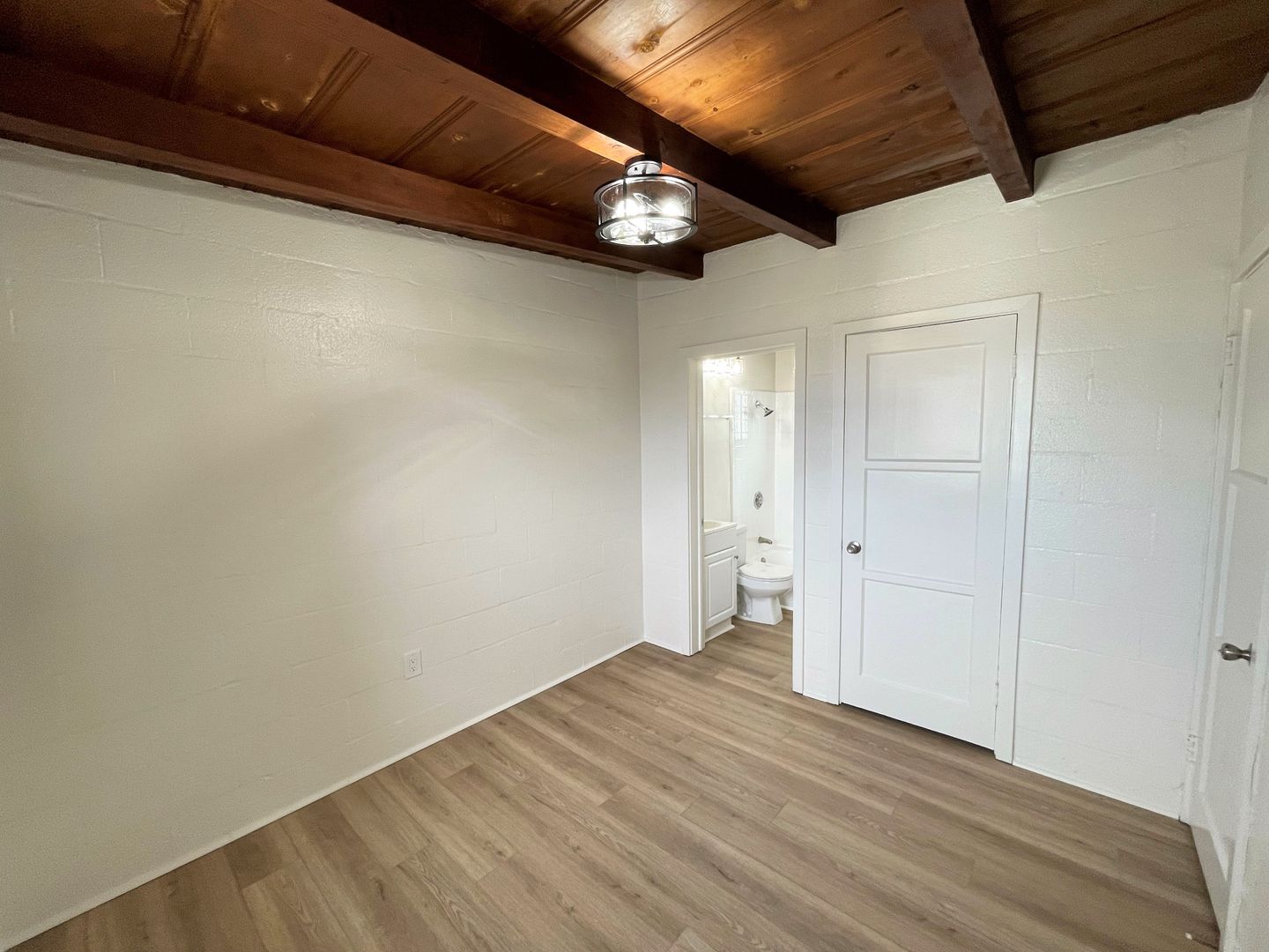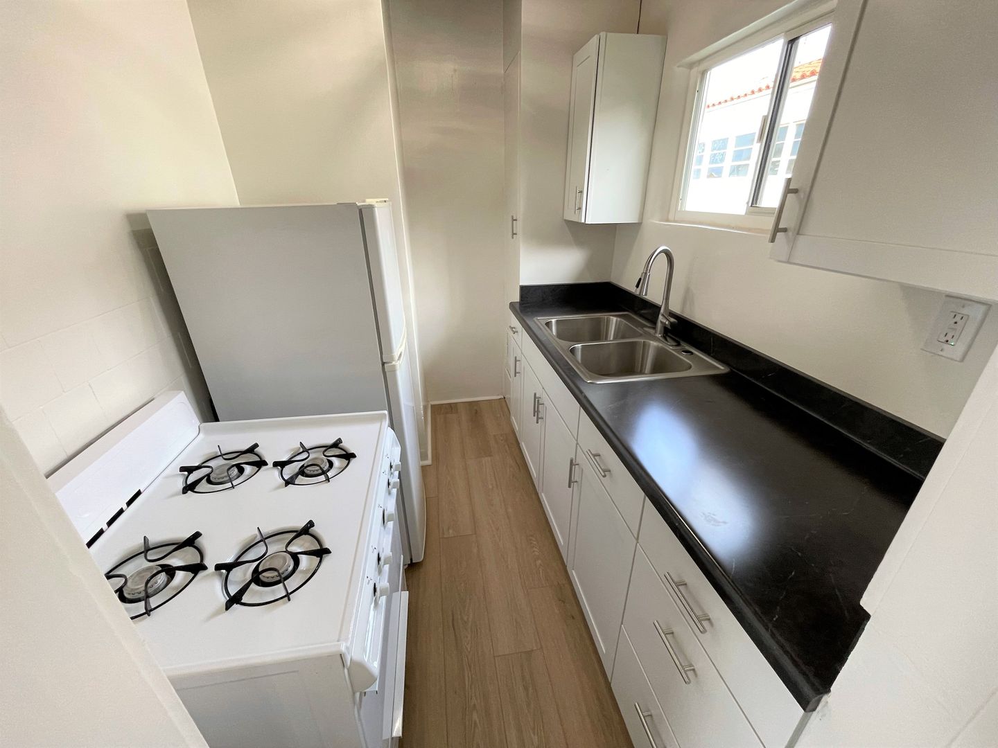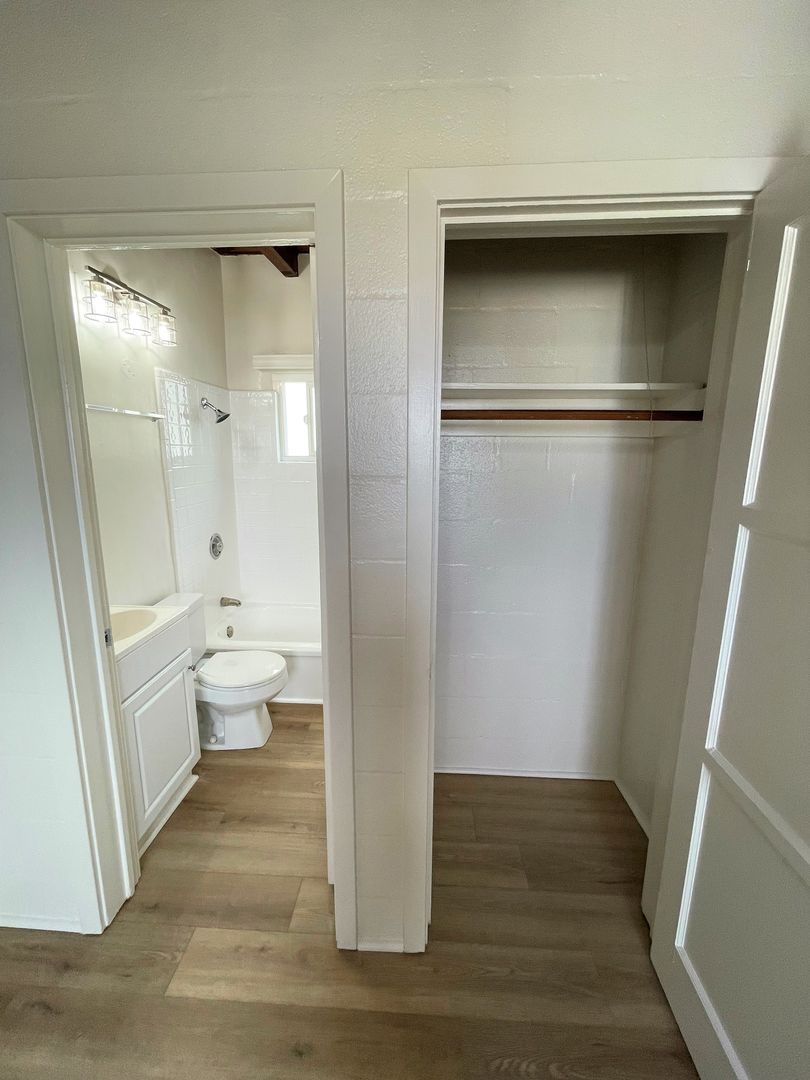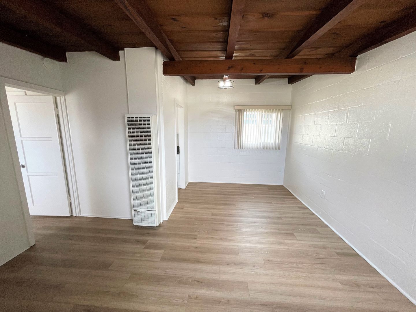 Charming Midtown Ventura Apartment! Enjoy beautiful ocean views as you walk up the staircase to this upstairs one bedroom one bath apartment! The interior has been remodeled with laminate wood flooring. The quaint living area has beautiful wood beam ceilings and a roomy closet. Your galley kitchen has been remodeled with white shaker style cabinetry, faux marble style countertops, and has a separate dining space.