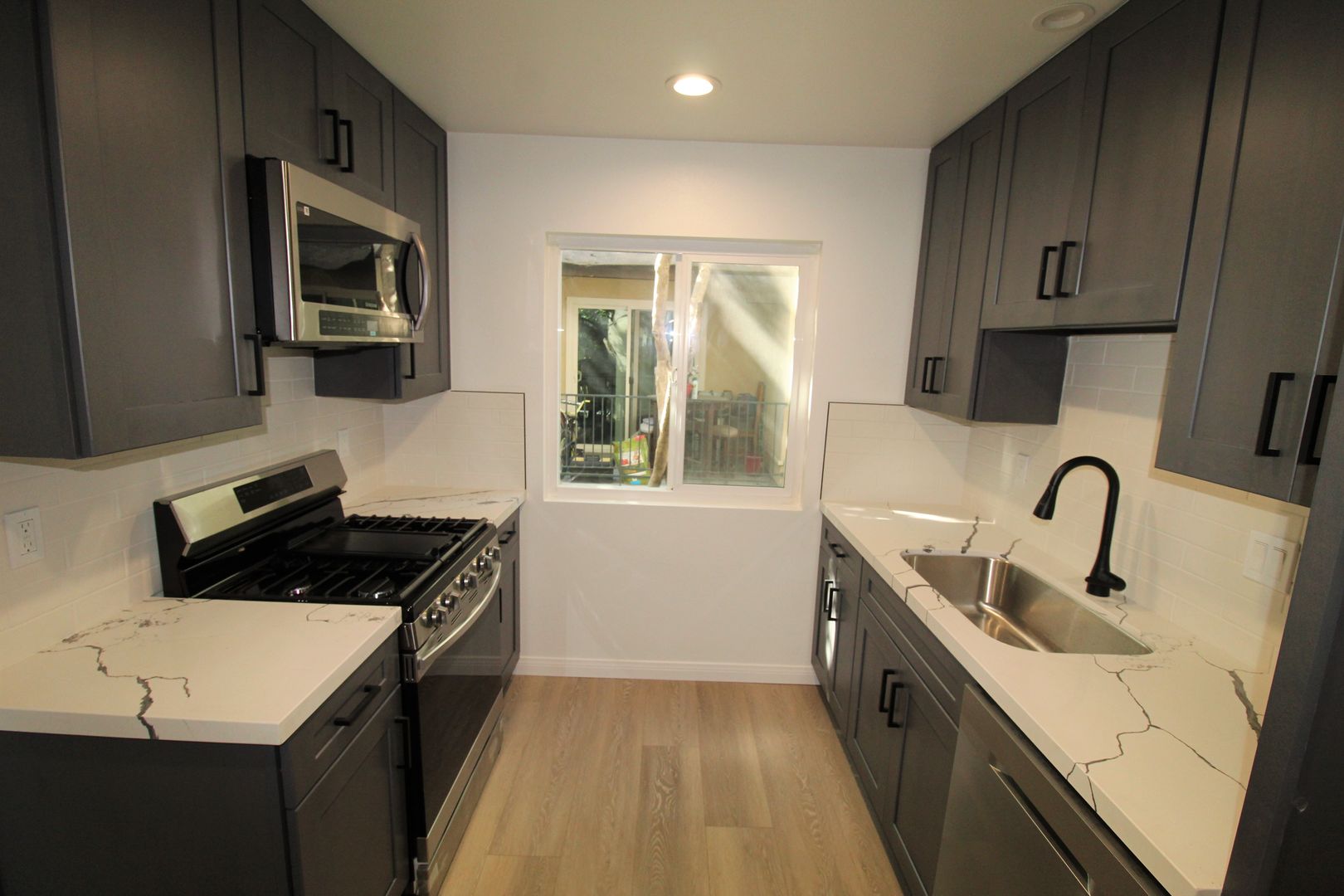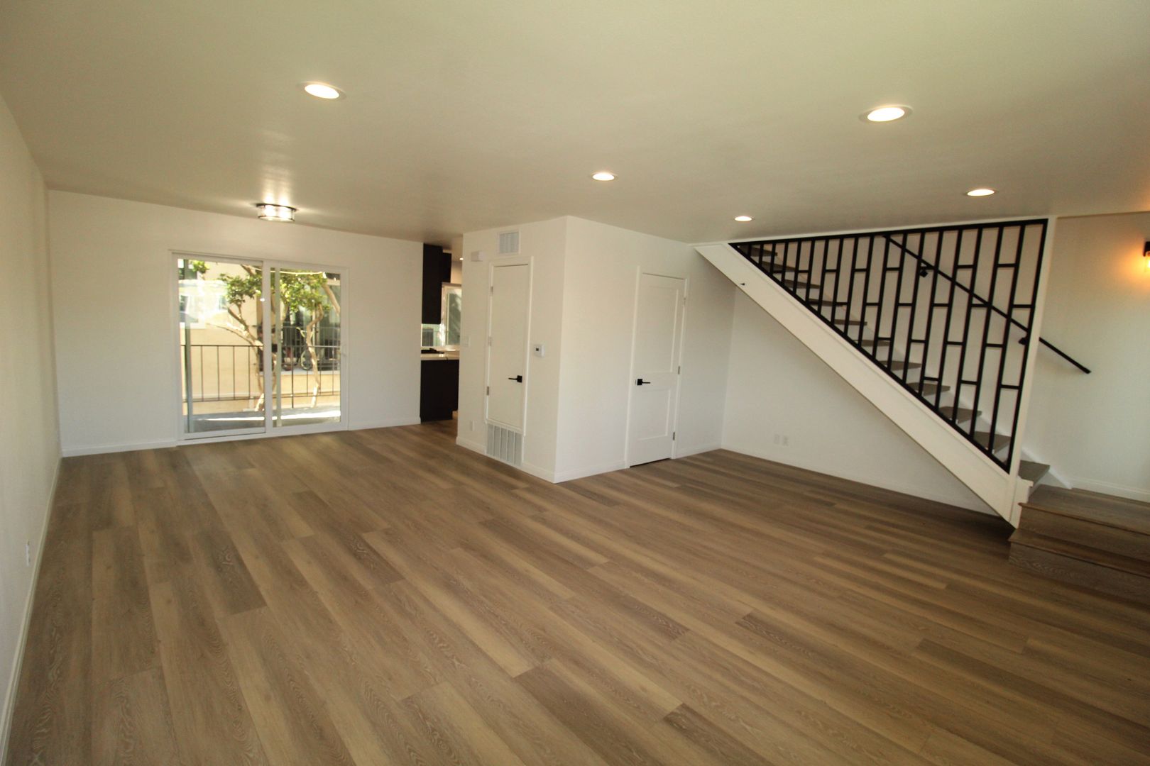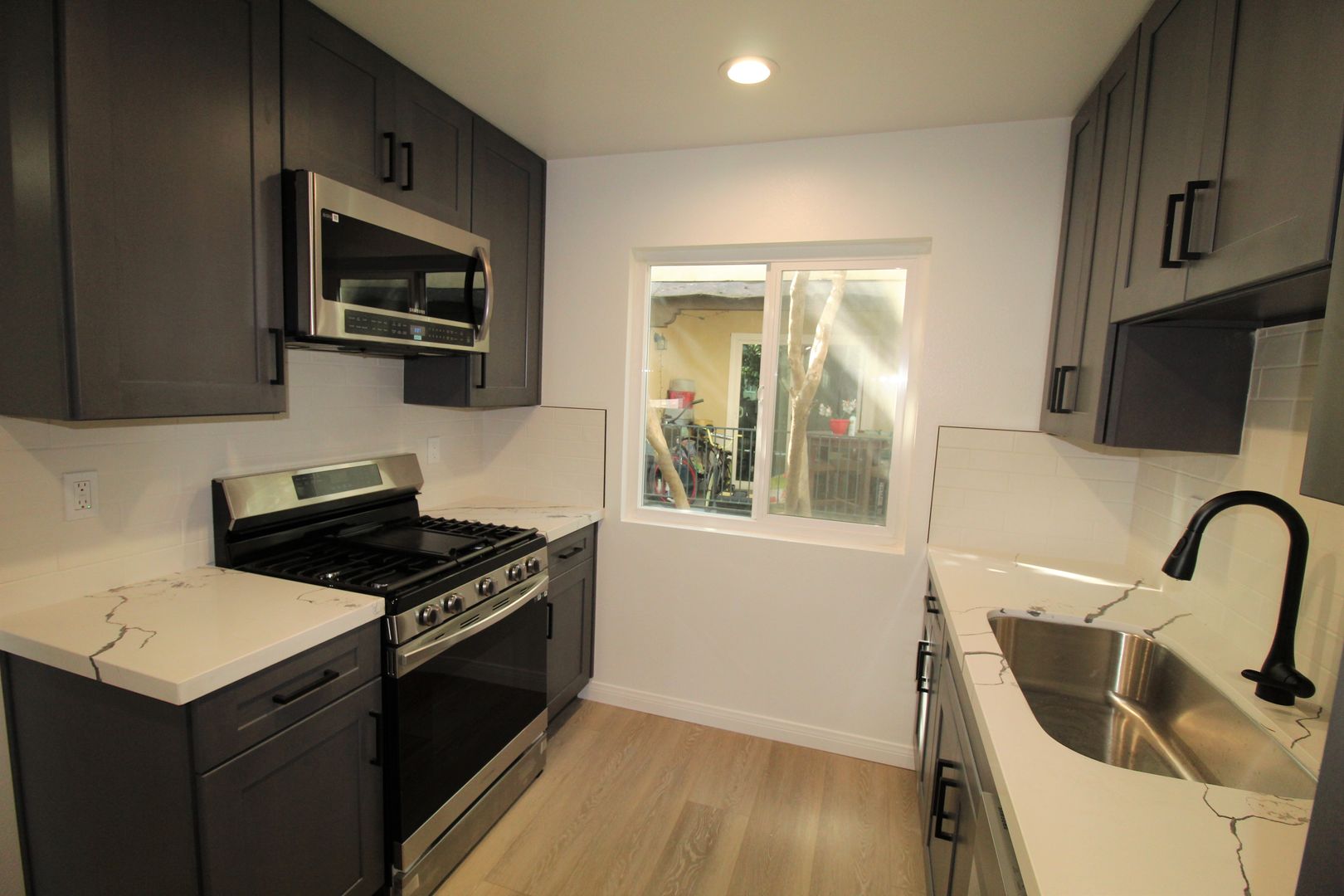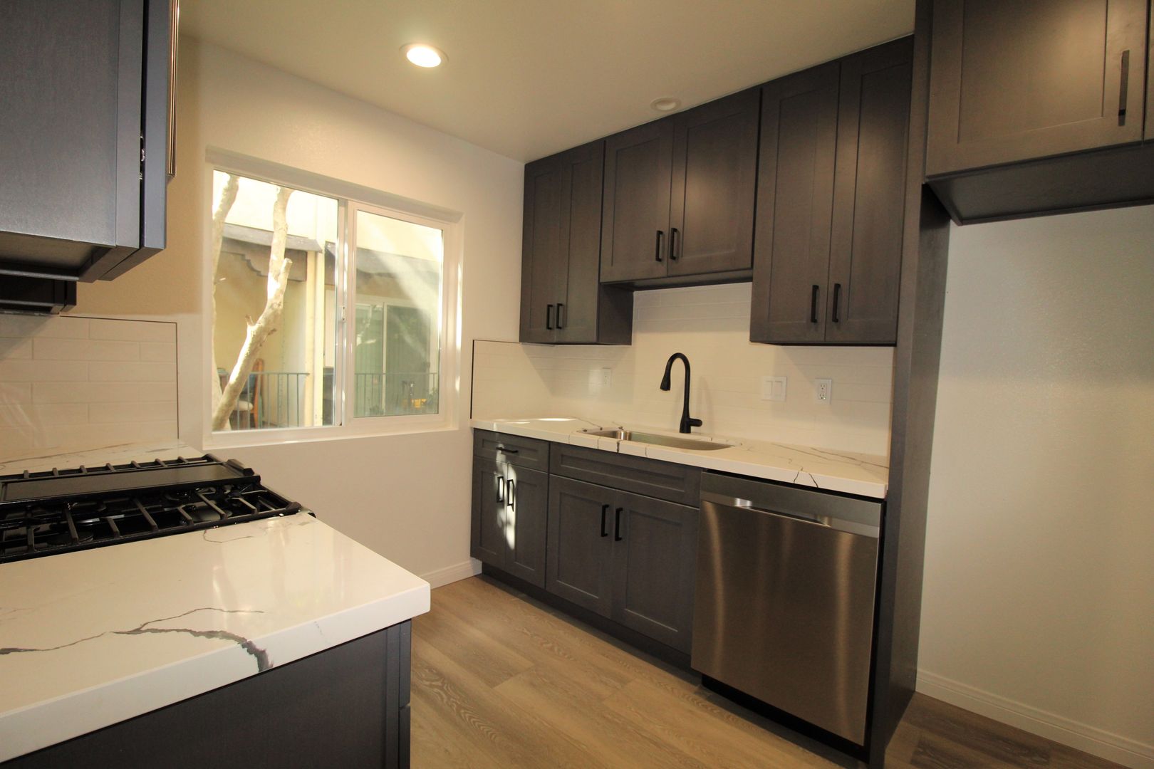 Midtown Ventura Townhome with a completely remodeled interior! Entering the interior of this two-story 2 Bedroom 2.5 Bath Townhome you are greeted with an open layout featuring high end laminate wood flooring, recessed lighting and iron staircase. The remodeled galley kitchen has a bold design style boasting custom cabinetry with soft closing drawers, quartz countertops, stainless steel Samsung appliances and black hardware.