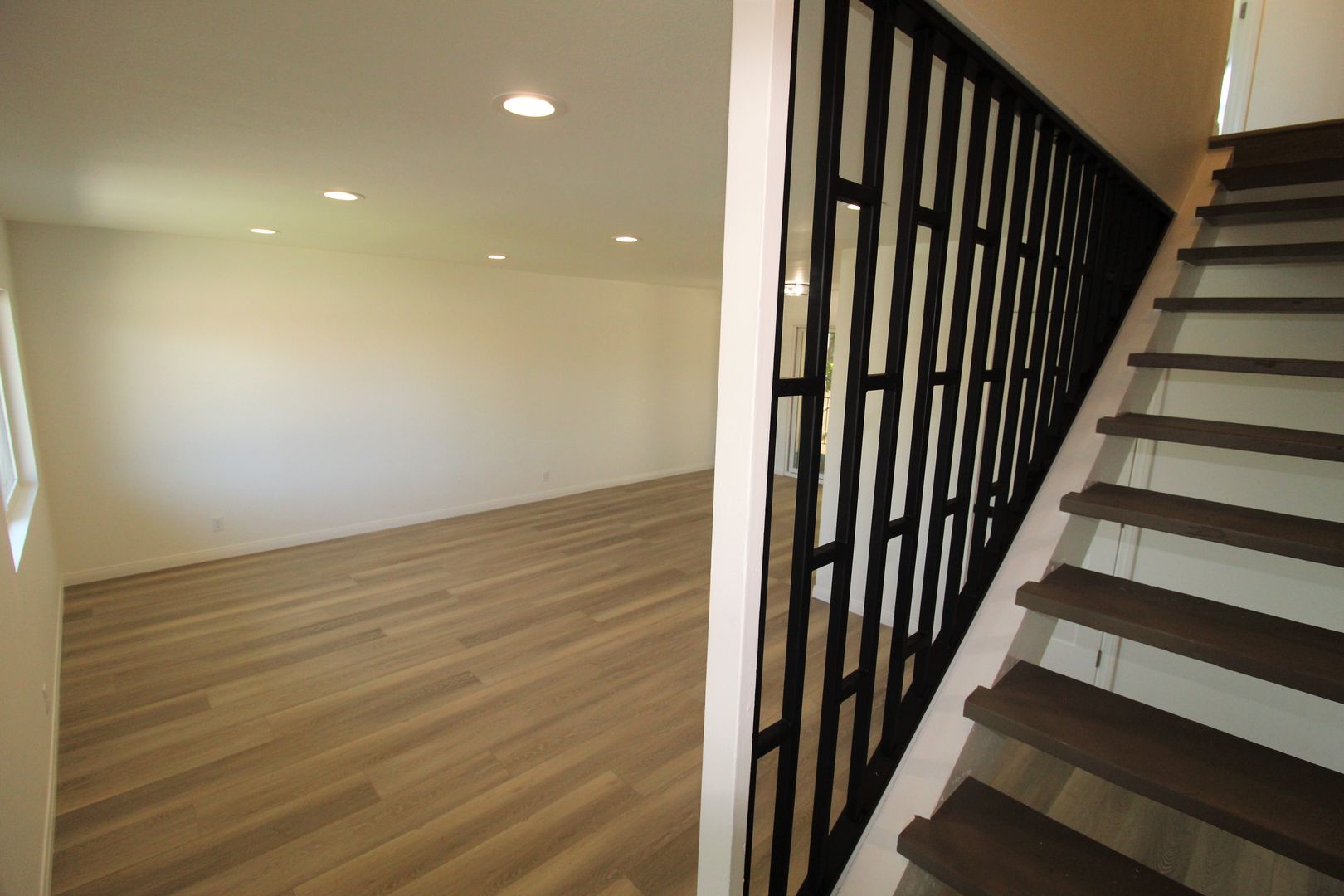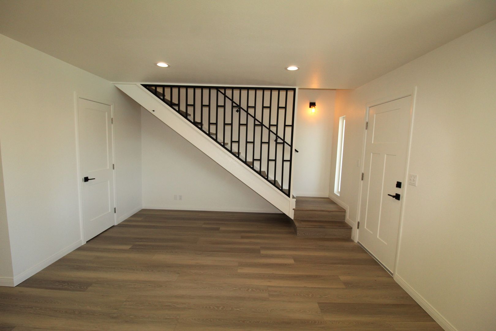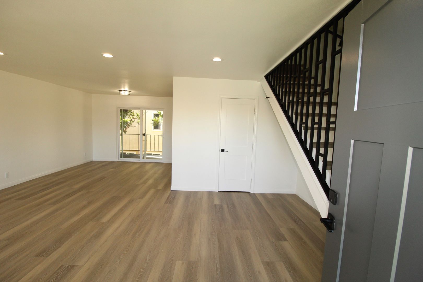 Midtown Ventura Townhome with a completely remodeled interior! Entering the interior of this two-story 2 Bedroom 2.5 Bath Townhome you are greeted with an open layout featuring high end laminate wood flooring, recessed lighting and iron staircase. The remodeled galley kitchen has a bold design style boasting custom cabinetry with soft closing drawers, quartz countertops, stainless steel Samsung appliances and black hardware.