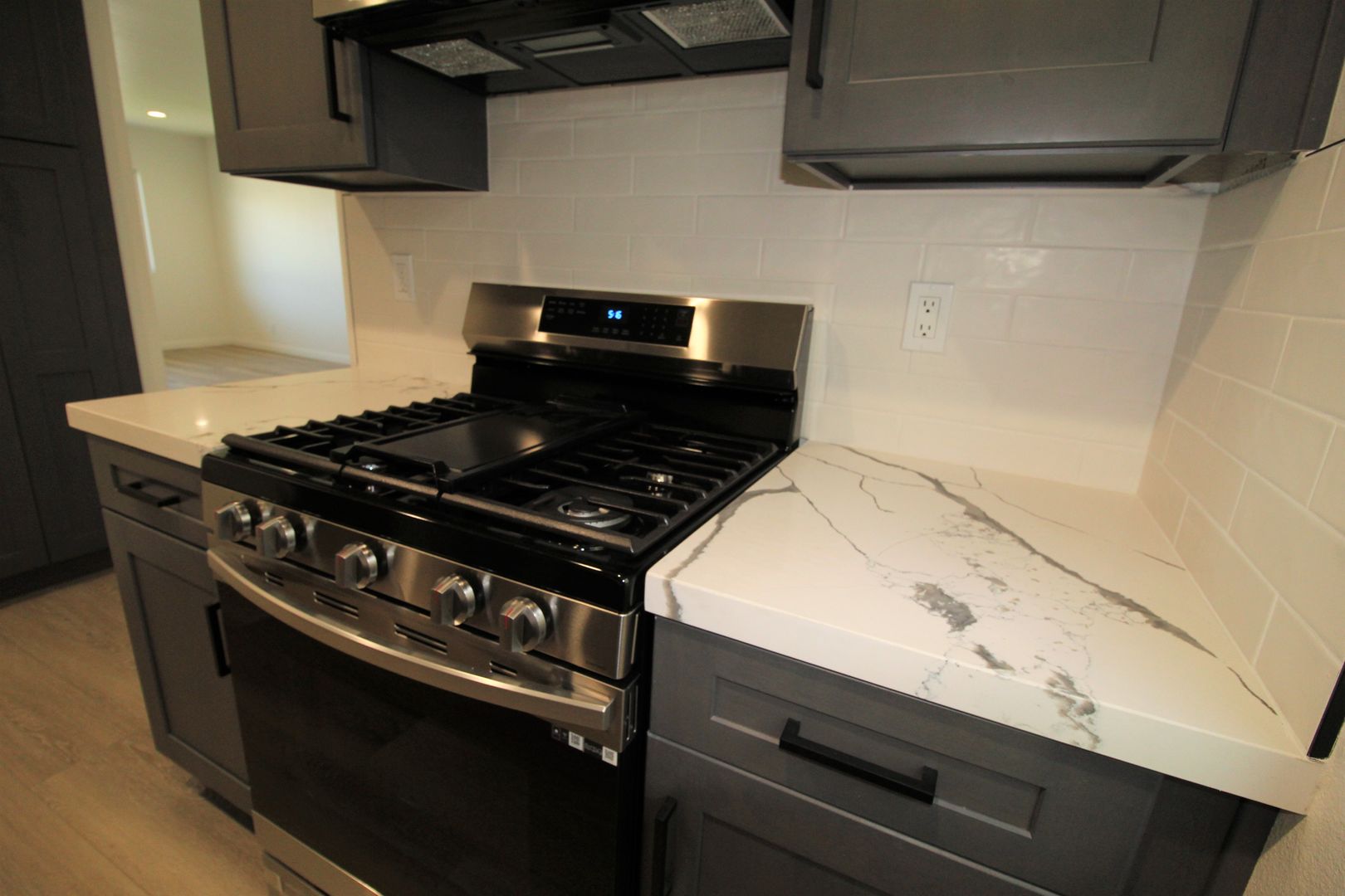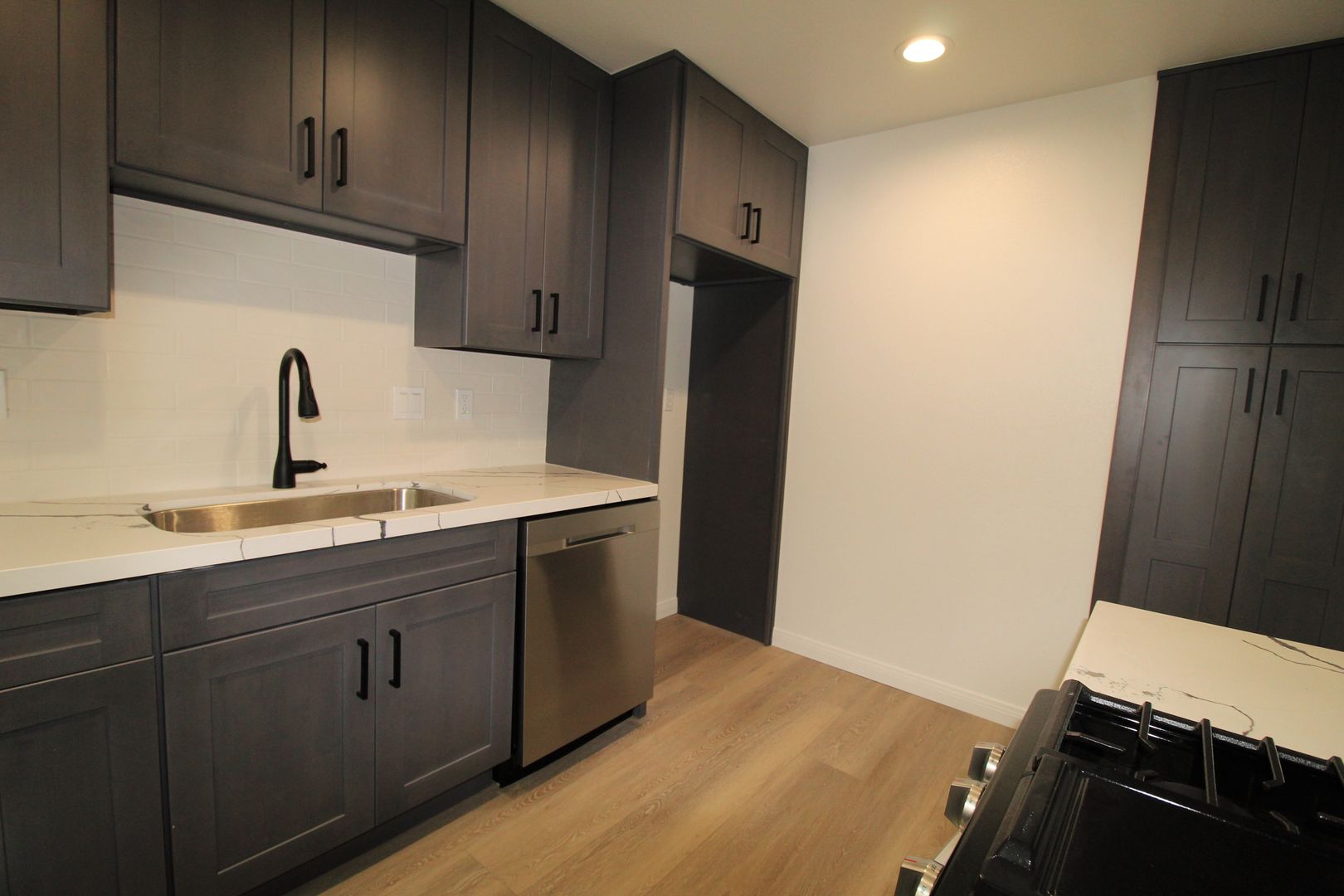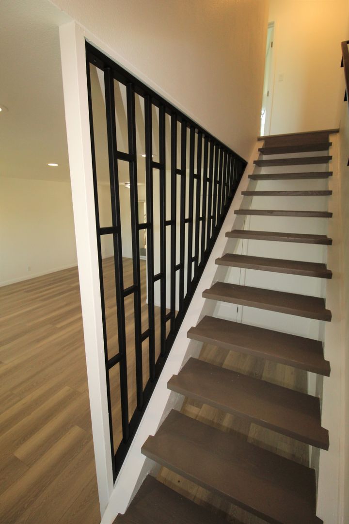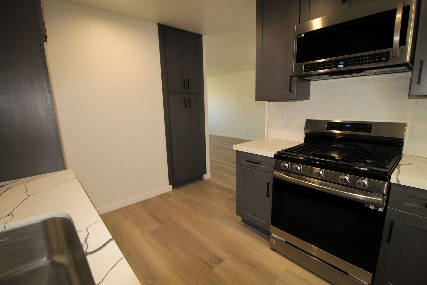 Midtown Ventura Townhome with a completely remodeled interior! Entering the interior of this two-story 2 Bedroom 2.5 Bath Townhome you are greeted with an open layout featuring high end laminate wood flooring, recessed lighting and iron staircase. The remodeled galley kitchen has a bold design style boasting custom cabinetry with soft closing drawers, quartz countertops, stainless steel Samsung appliances and black hardware.