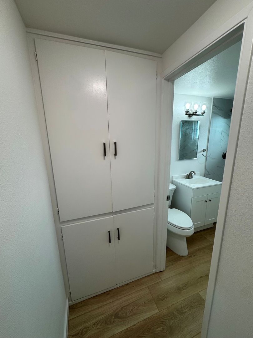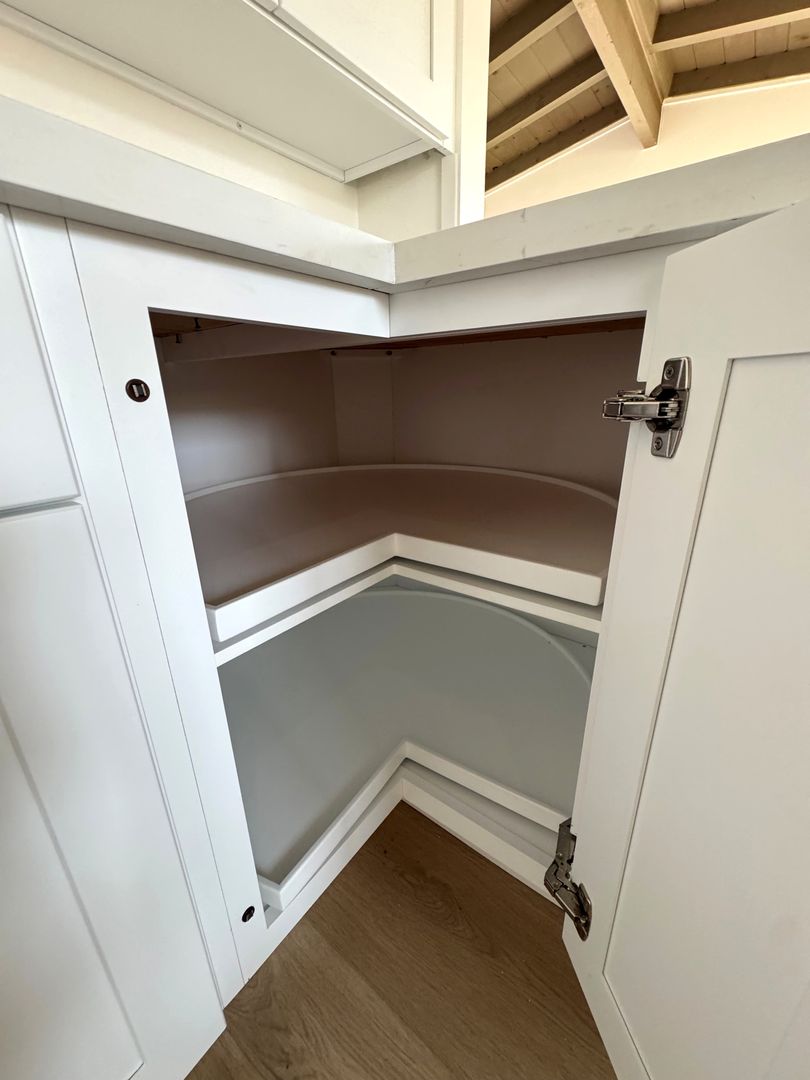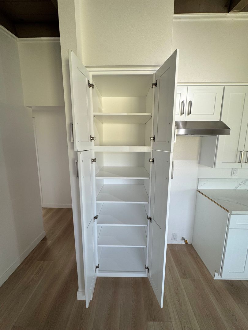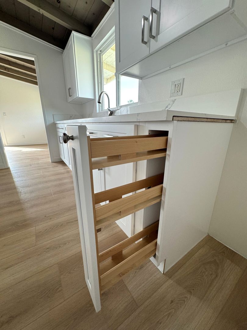 The kitchen has been thoughtfully redesigned with brand new white shaker cabinetry offering excellent storage, including a built-in spice rack, lazy Susan, and pantry. Quartz countertops and new stainless steel appliances complete the modern, clean look.