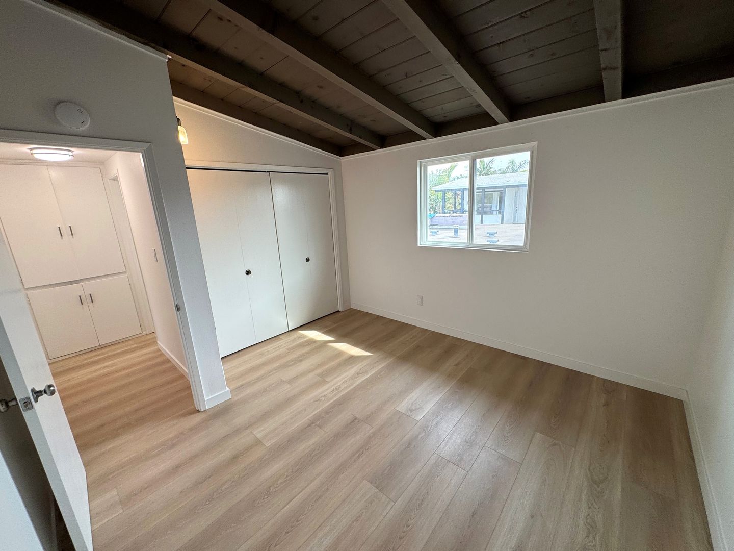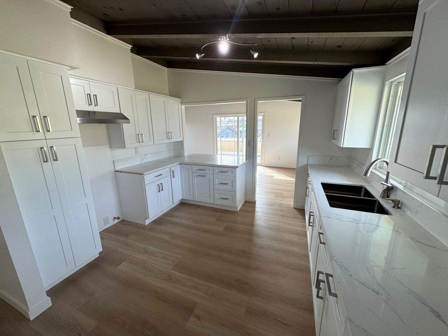 This light-filled upstairs unit has been fully renovated and offers a spacious living area featuring brand new laminate wood flooring, stunning vaulted wood beam ceilings, and direct access to a private front deck where you can enjoy ocean views and coastal breezes.