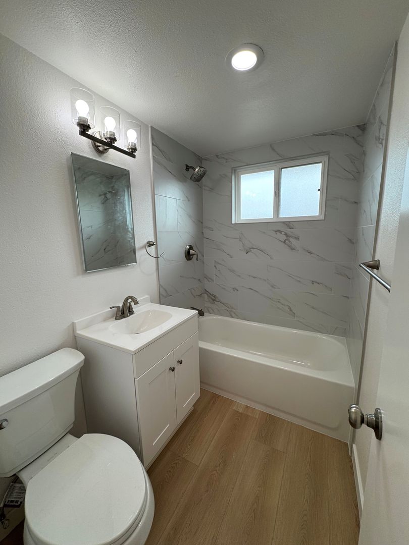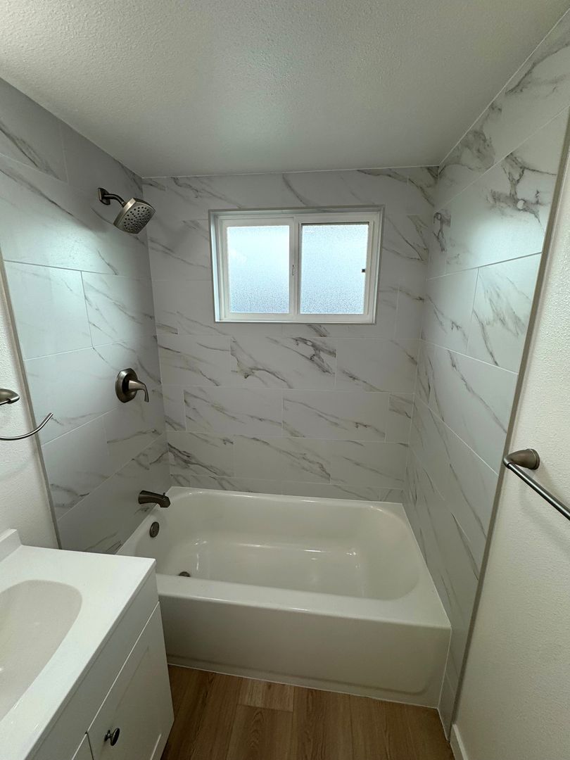 The bathroom has also been fully remodeled with a new vanity, bathtub, and a beautifully tiled shower enclosure. Additional upgrades include fresh interior paint, new lighting throughout, new blinds, and dual-pane vinyl windows for improved comfort and efficiency.