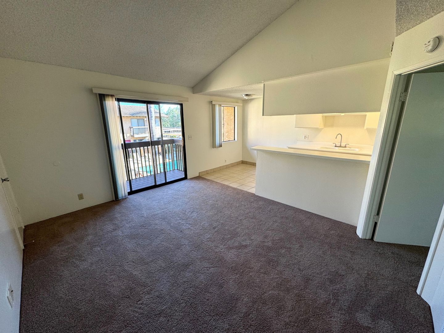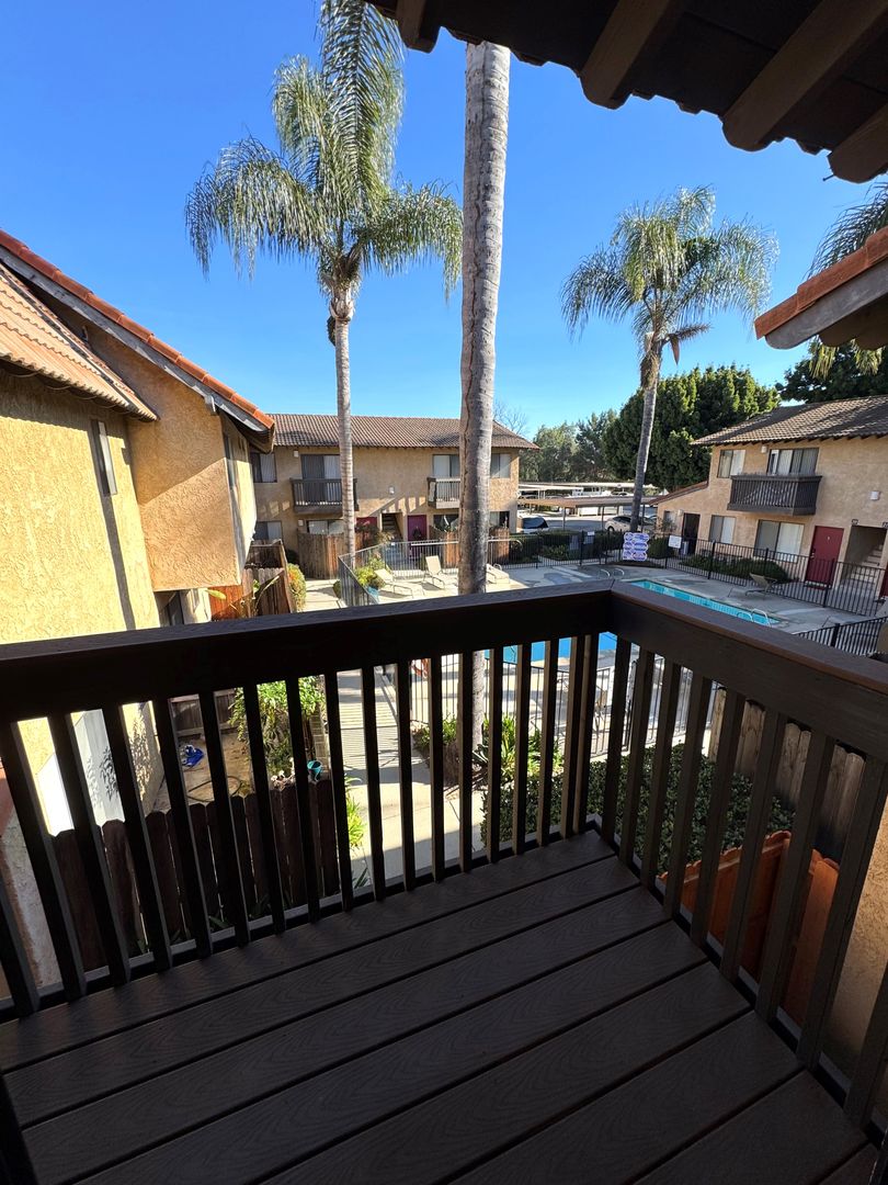 This upstairs apartment features a spacious one bedroom one bath layout with private balcony overlooking the pool. The bright eat-in kitchen is prepared with stove, refrigerator, and breakfast bar. Water and trash services included in your rent. One assigned carport space for easy parking.