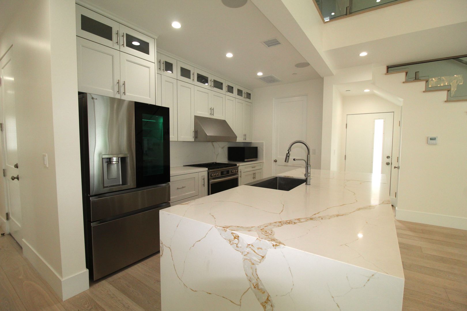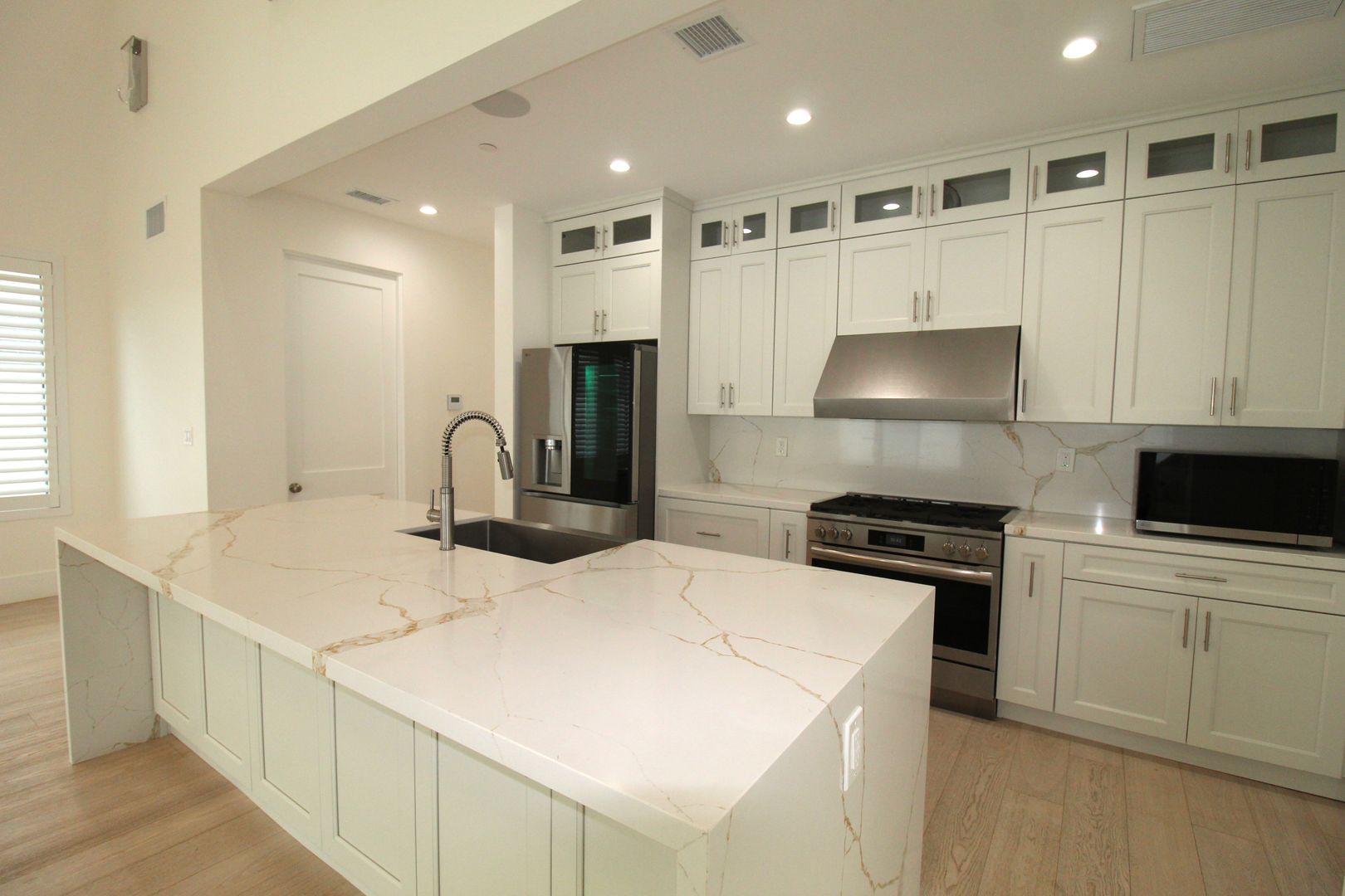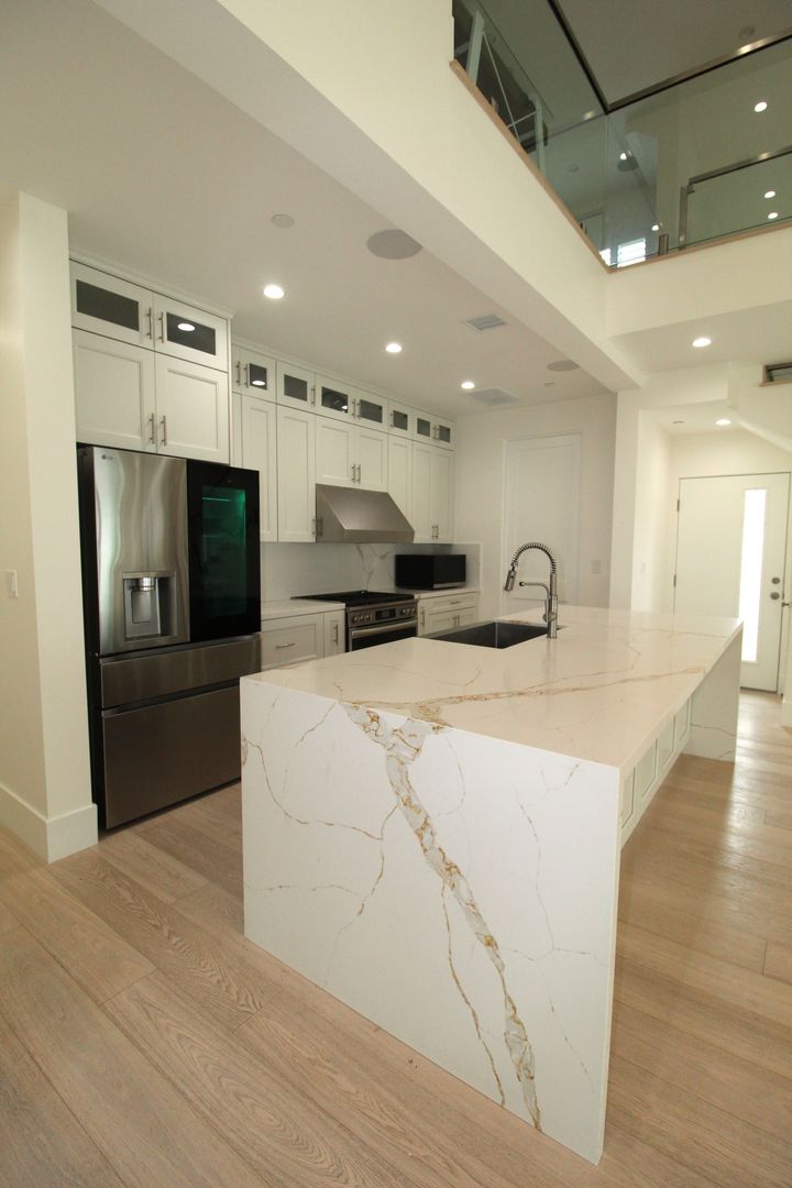 Step inside to an impressive open-concept dining and kitchen area, where 24-foot soaring ceilings, a show-stopping designer chandelier, and expansive windows create a light and airy ambiance perfect for entertaining. The gourmet kitchen is a chef’s dream, featuring crisp white shaker-style cabinetry, quartz countertops with a stunning waterfall edge, and top-of-the-line stainless steel appliances. Every detail has been meticulously curated for both beauty and performance.