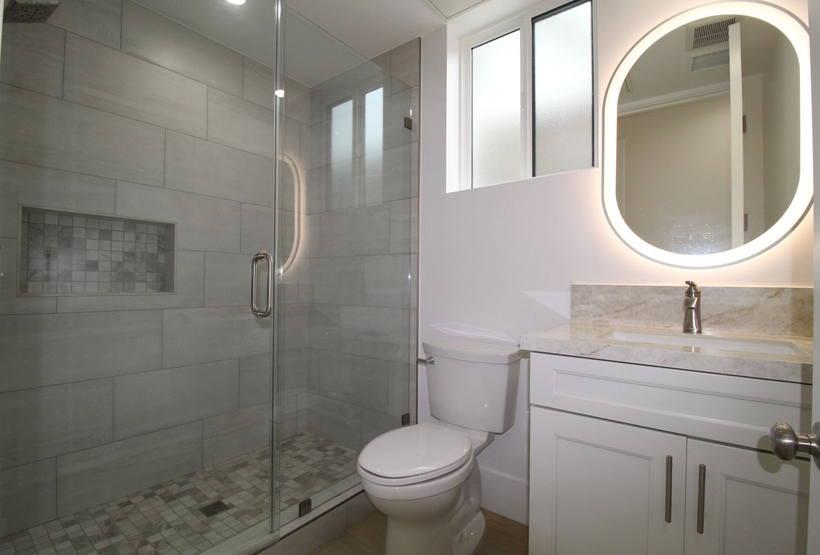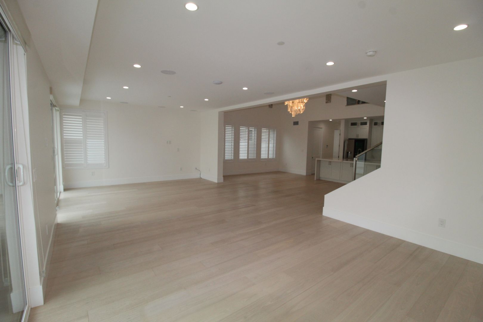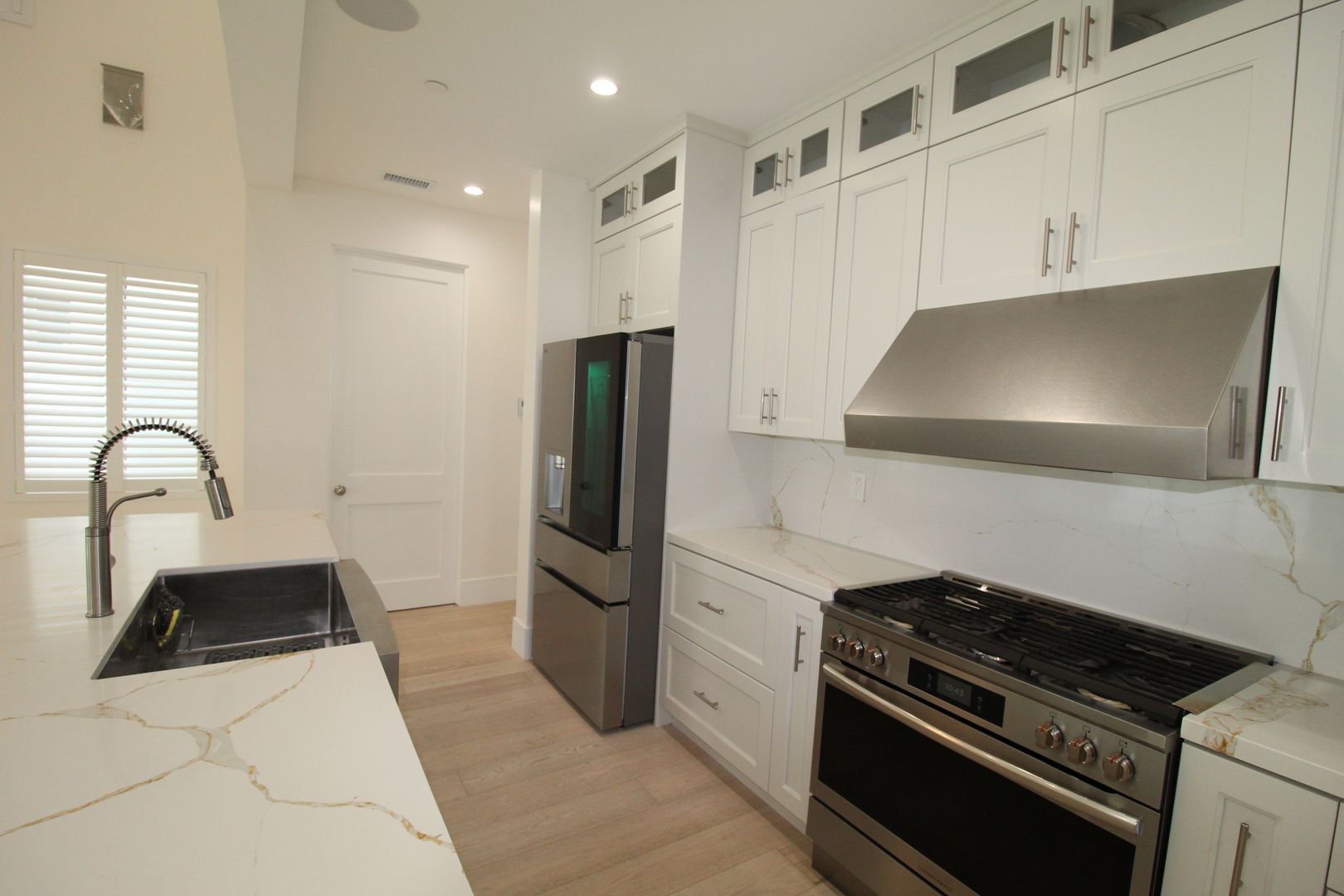 Step inside to an impressive open-concept dining and kitchen area, where 24-foot soaring ceilings, a show-stopping designer chandelier, and expansive windows create a light and airy ambiance perfect for entertaining. The gourmet kitchen is a chef’s dream, featuring crisp white shaker-style cabinetry, quartz countertops with a stunning waterfall edge, and top-of-the-line stainless steel appliances. Every detail has been meticulously curated for both beauty and performance.