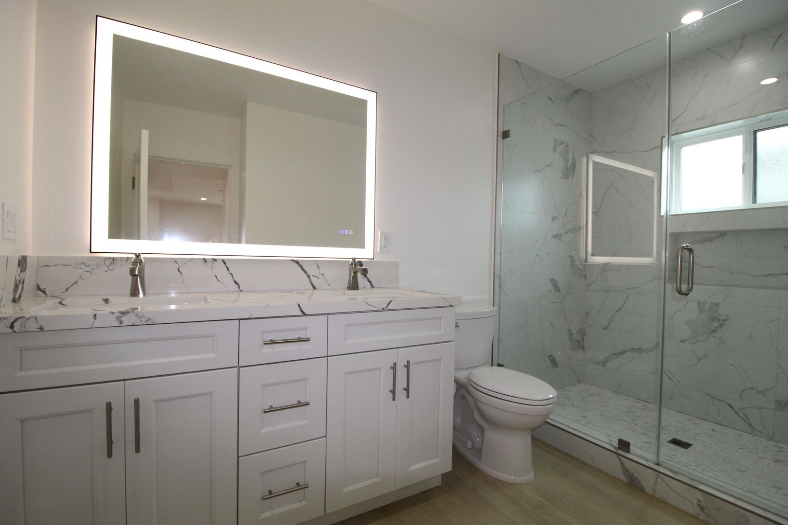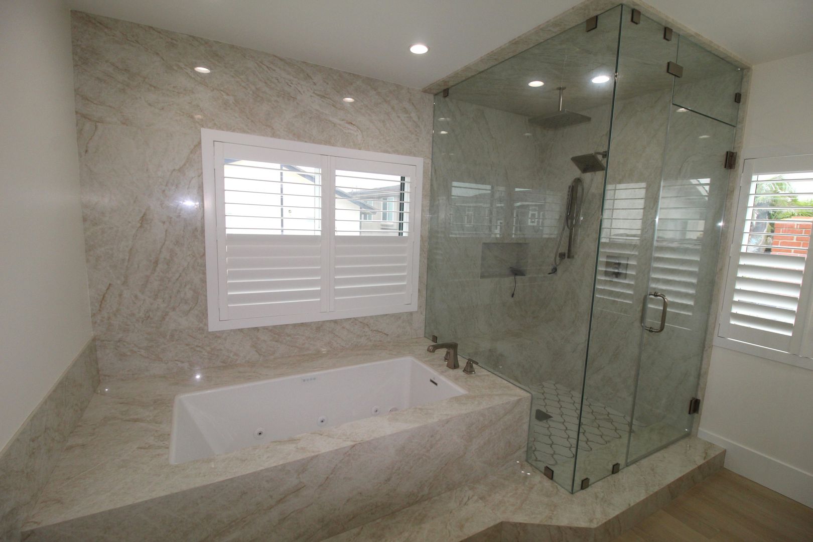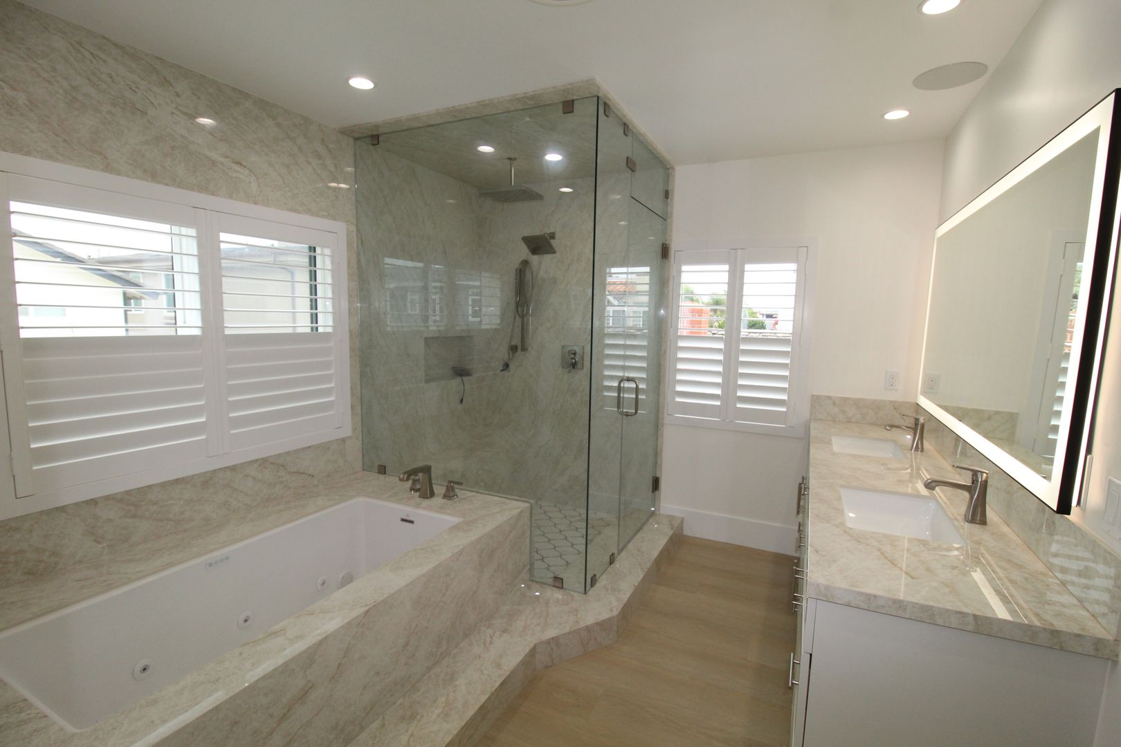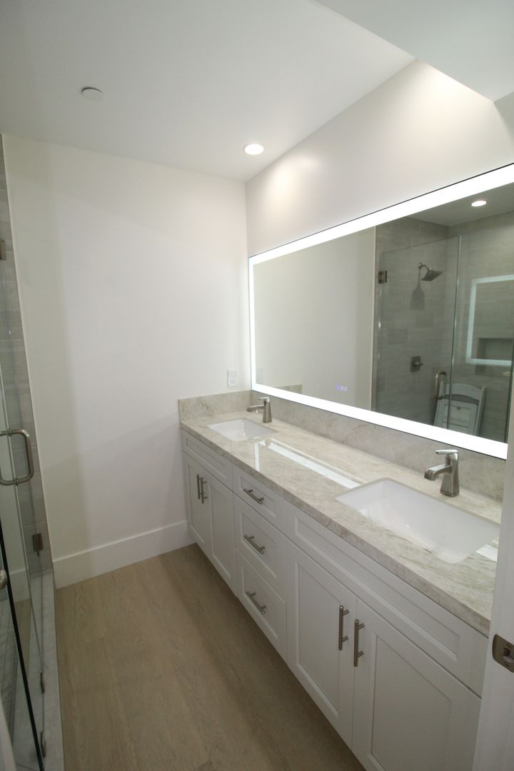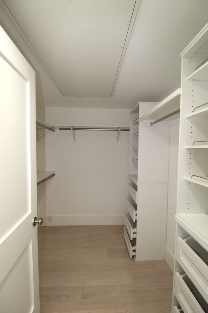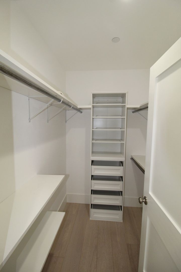 Each of the four bedrooms functions as its own private suite, complete with en-suite bathrooms for ultimate comfort and privacy. One suite is conveniently located on the main floor, perfect for guests or multi-generational living — while the remaining three are upstairs, including the stunning primary suite tucked away across a glass railing breezeway. The primary features a private balcony, an oversized spa-like bathroom adorned with porcelain slab walls, a soaking jacuzzi tub, a steam shower with triple shower heads, and a custom walk-in closet with built-in organizers.