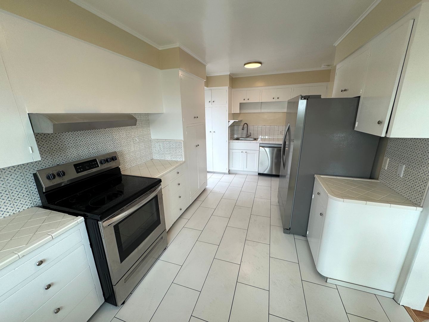 Step inside to a large living area featuring beautifully refinished hardwood floors, a stone fireplace, and expansive windows framing your private backyard and sweeping ocean views. The chef’s kitchen boasts stainless steel appliances, dual sinks, breakfast nook with built-in buffet, and a formal dining room for entertaining.