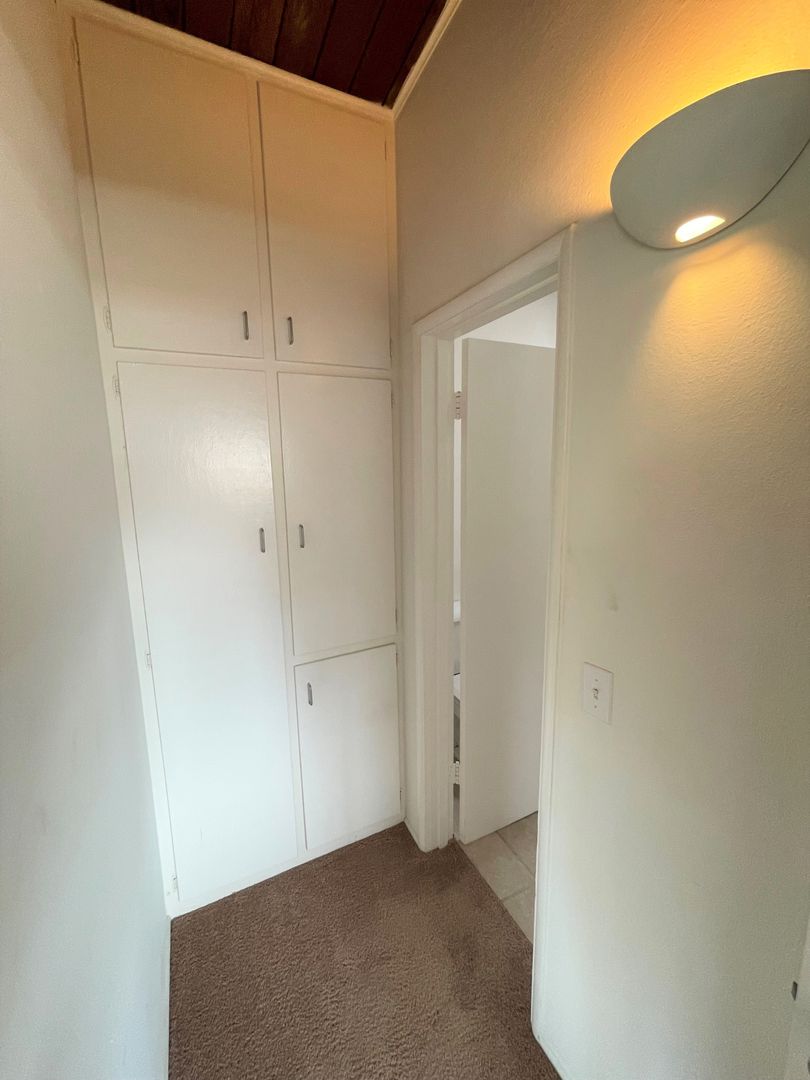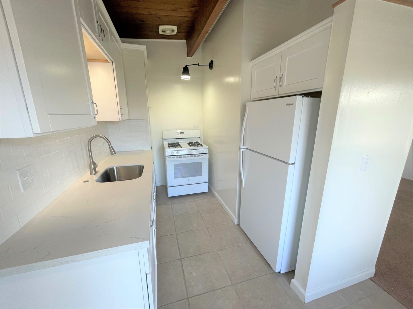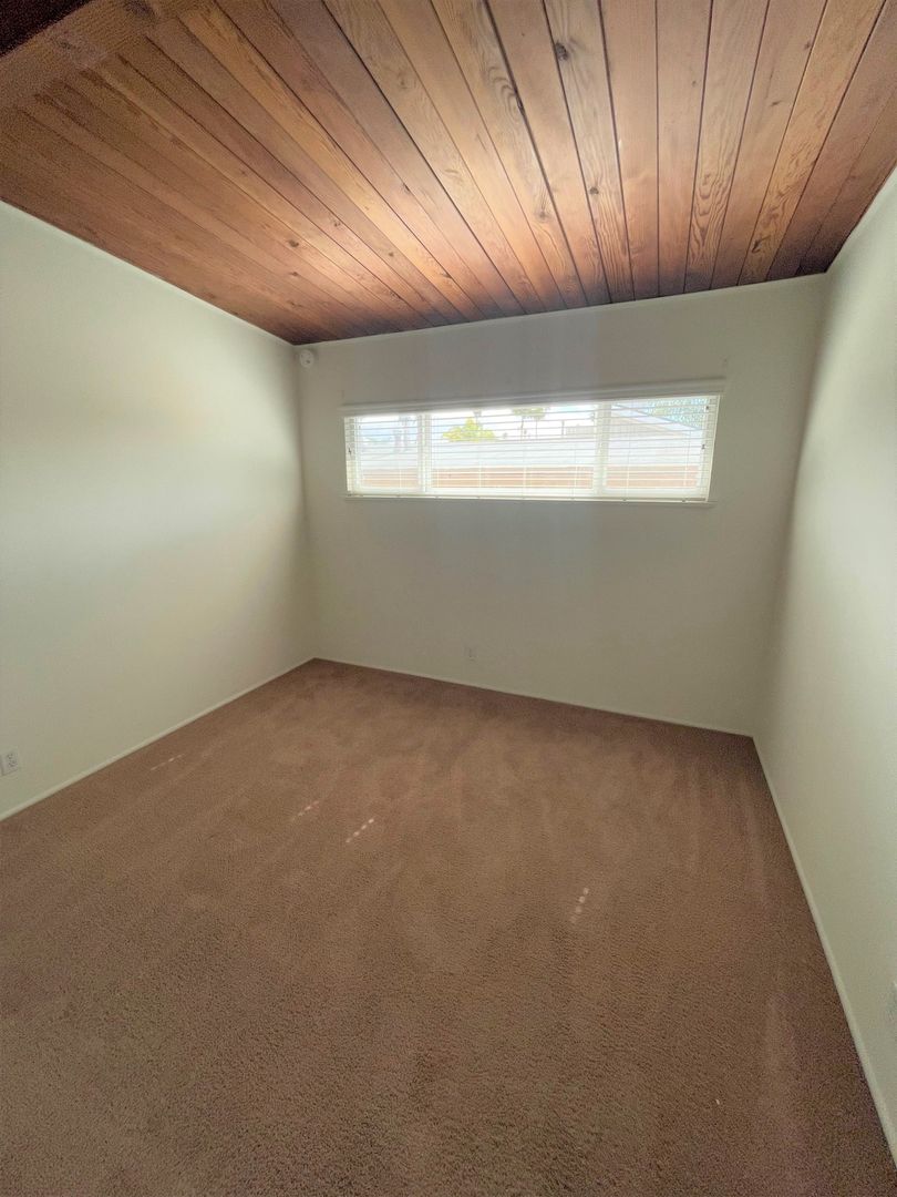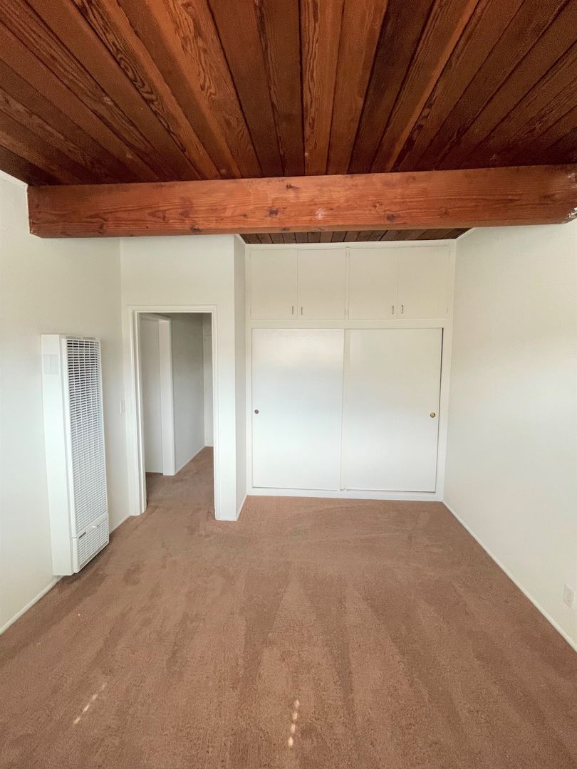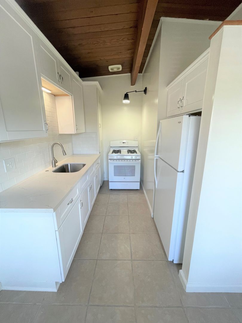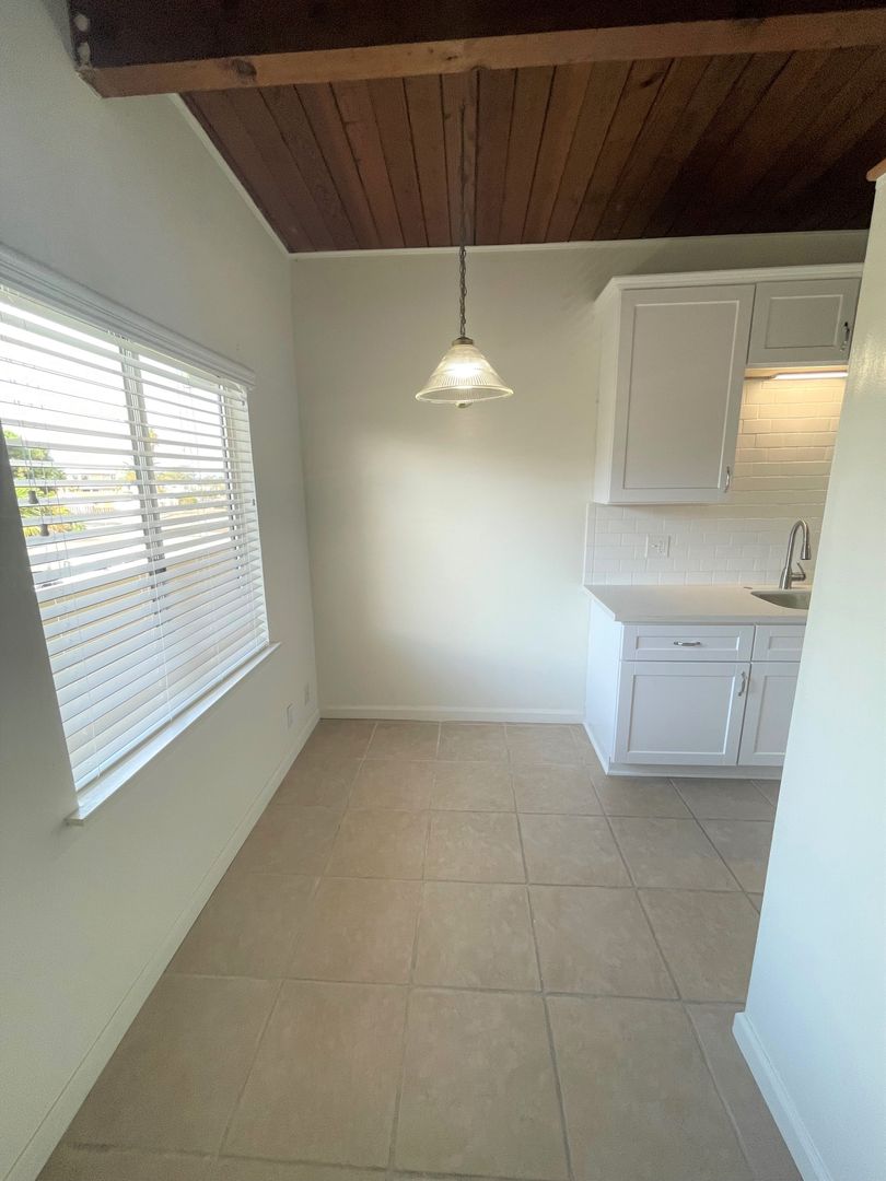 Adorable Carpinteria Beach Apartment located just across the street from the sand! Entering this upstairs 1 bedroom 1 bath apartment you are greeted with beautiful wood beam ceilings and newer plush carpeting. Your galley kitchen is open to a small dining area and features bright white cabinets, quartz countertops and subway tile backsplash, with a gas stove and refrigerator provided. The spacious bedroom has a large closet with additional storage in the hall.