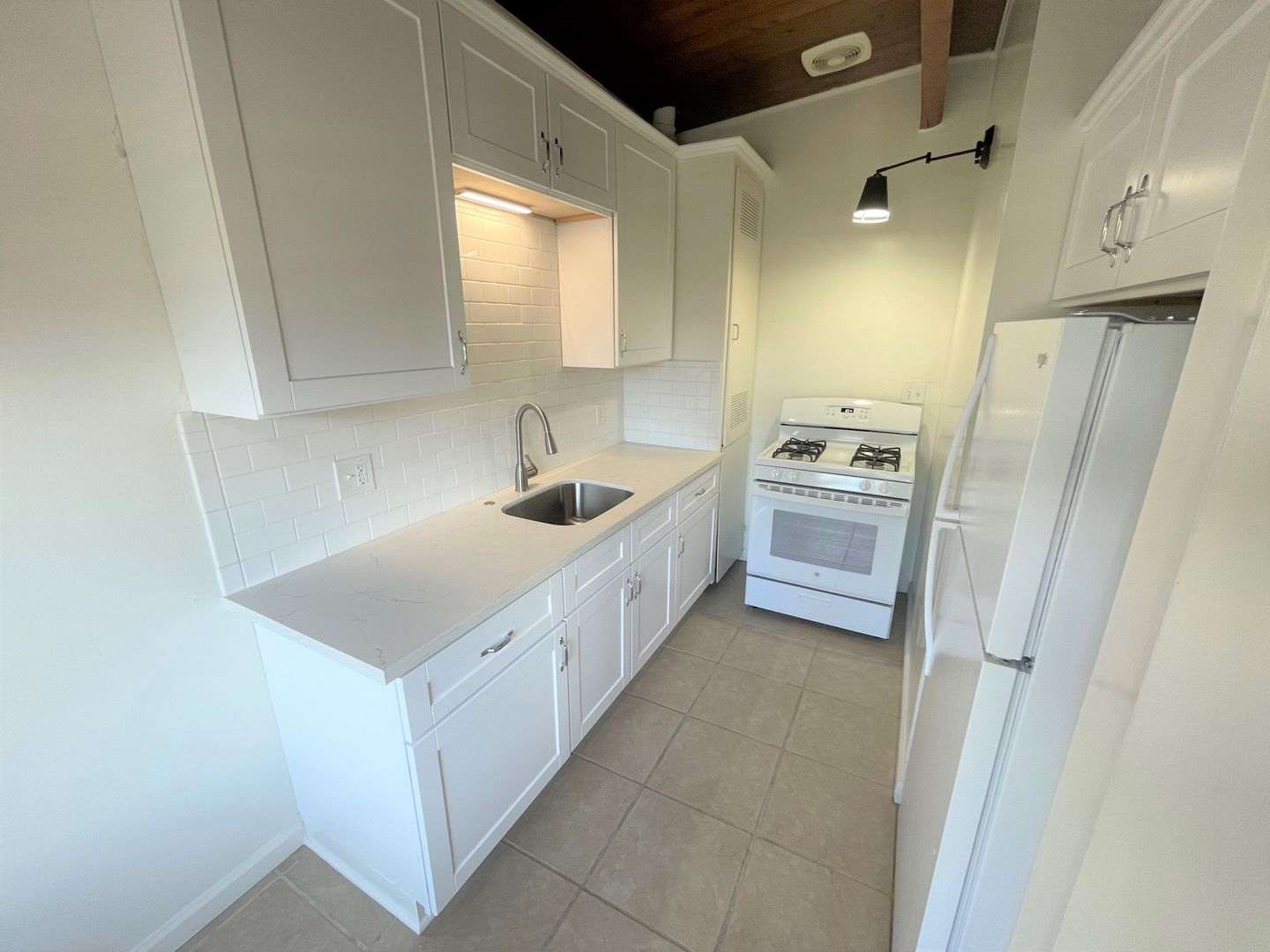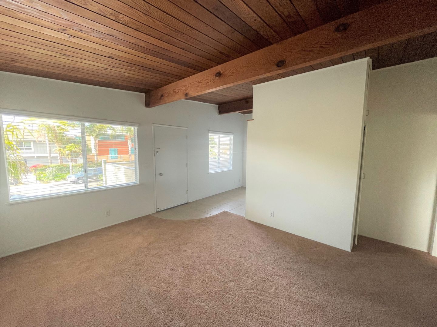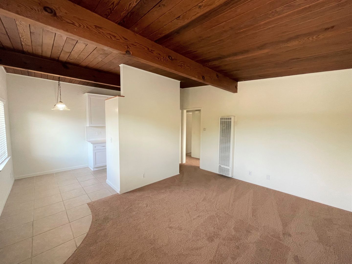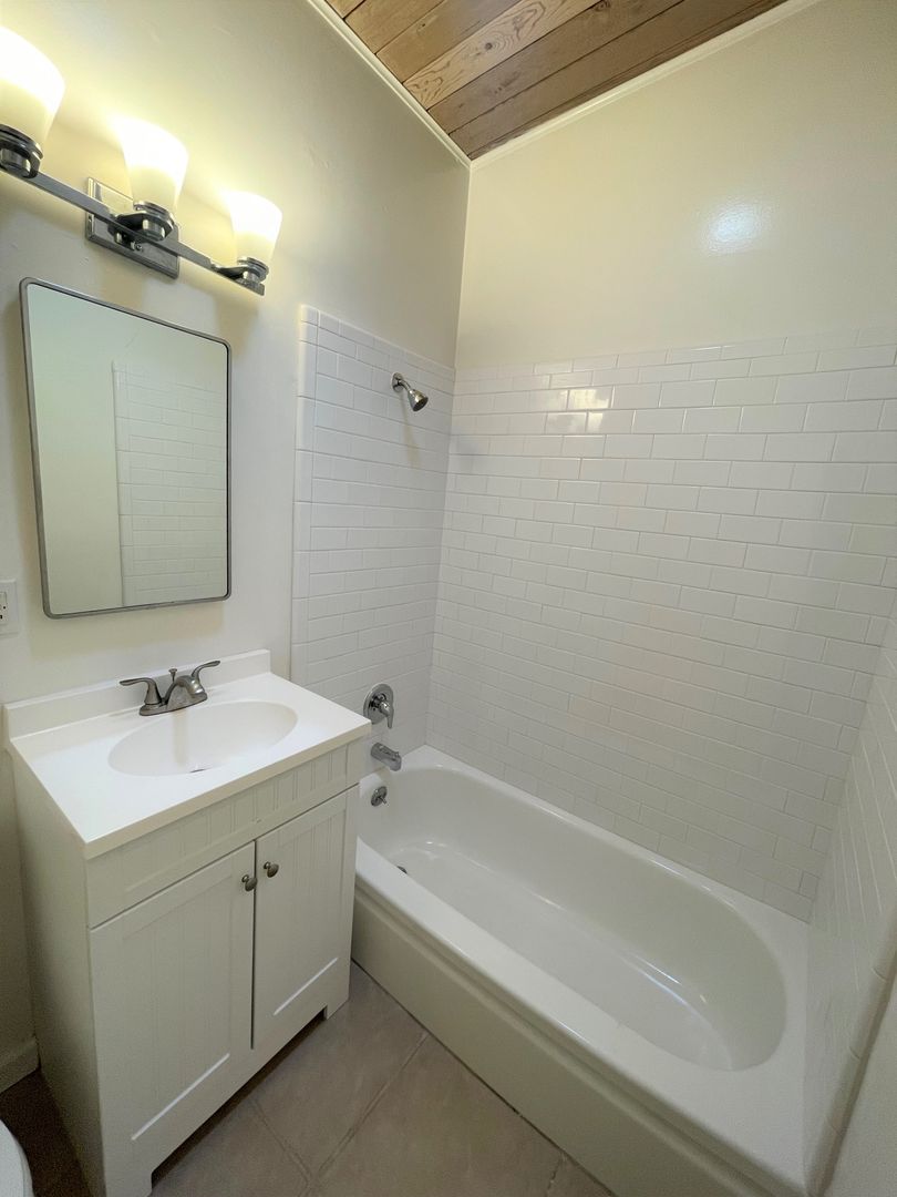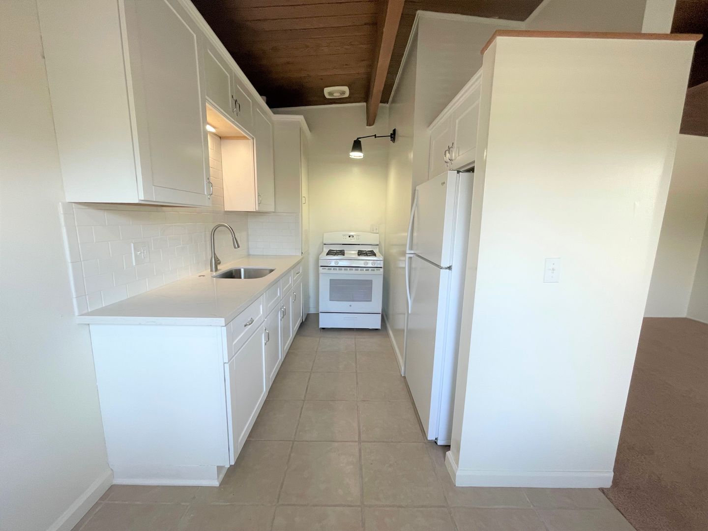 Adorable Carpinteria Beach Apartment located just across the street from the sand! Entering this upstairs 1 bedroom 1 bath apartment you are greeted with beautiful wood beam ceilings and newer plush carpeting. Your galley kitchen is open to a small dining area and features bright white cabinets, quartz countertops and subway tile backsplash, with a gas stove and refrigerator provided. The spacious bedroom has a large closet with additional storage in the hall.