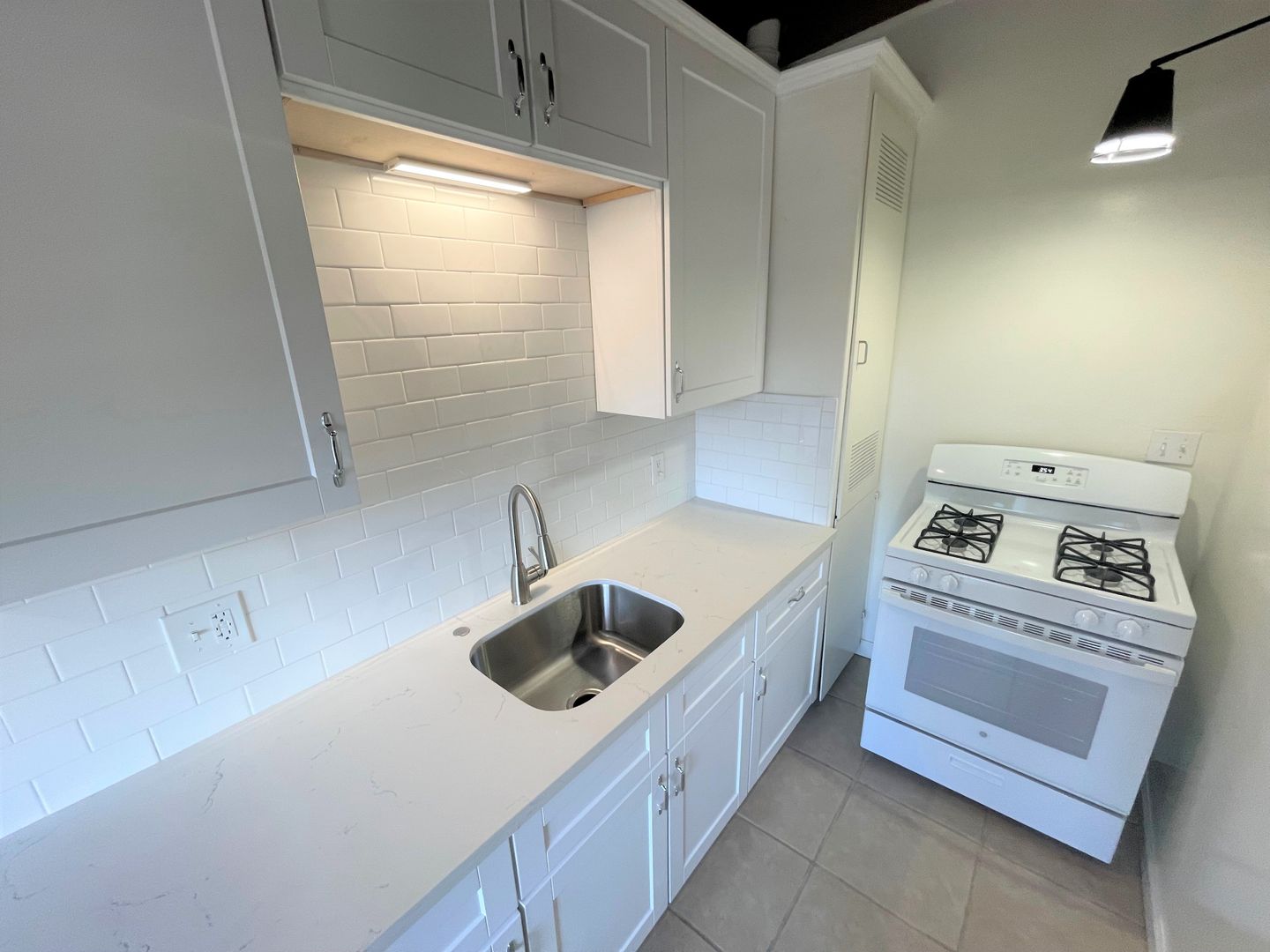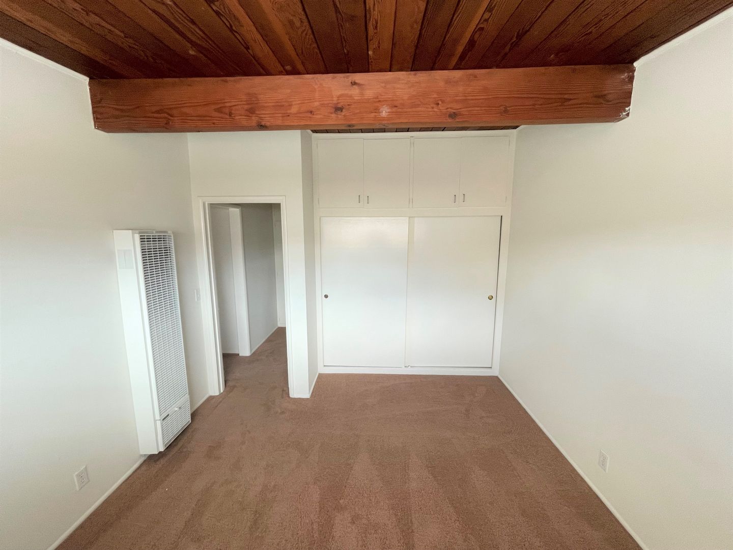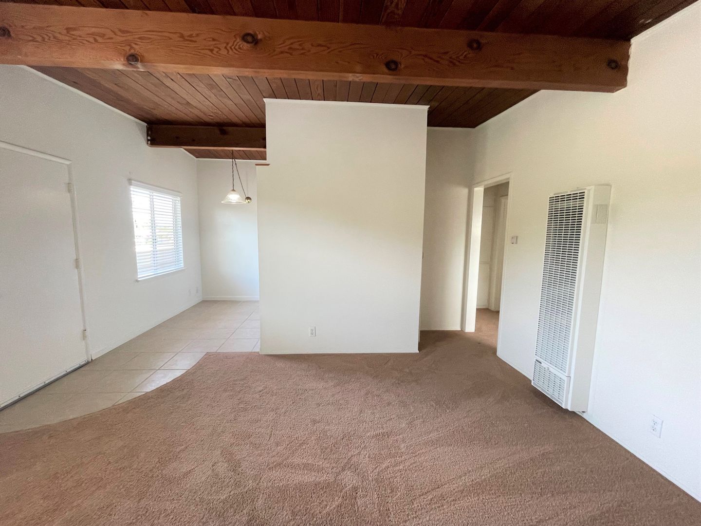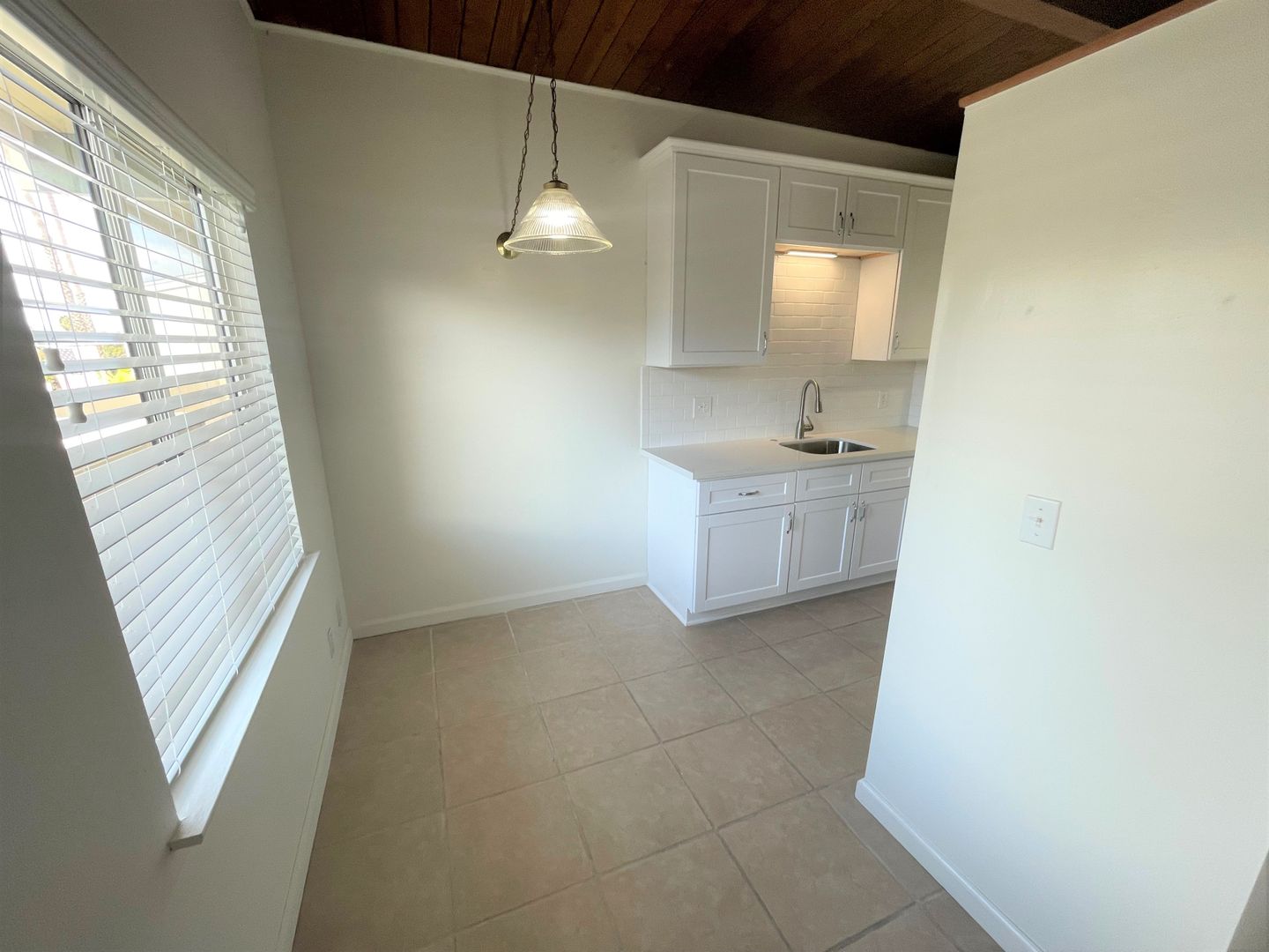 Adorable Carpinteria Beach Apartment located just across the street from the sand! Entering this upstairs 1 bedroom 1 bath apartment you are greeted with beautiful wood beam ceilings and newer plush carpeting. Your galley kitchen is open to a small dining area and features bright white cabinets, quartz countertops and subway tile backsplash, with a gas stove and refrigerator provided. The spacious bedroom has a large closet with additional storage in the hall.